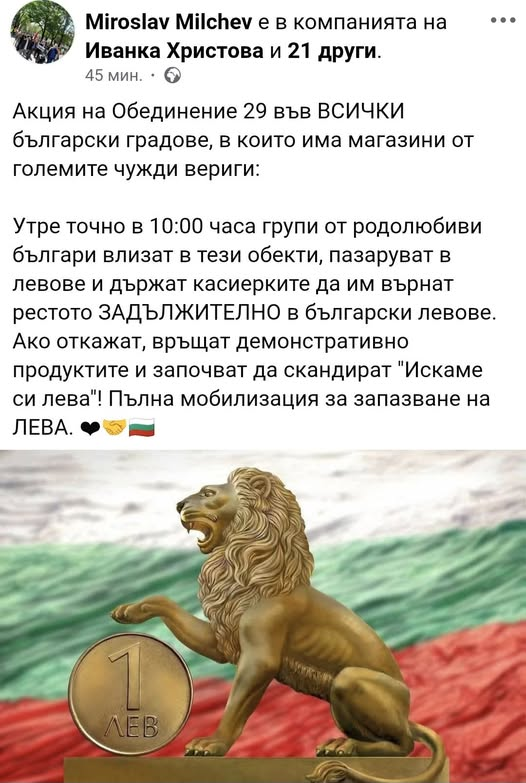 Нова акция в лалаленд…Утре копейките в големите вериги, ще изискват от касиерите да им се връща в лева и ако това им бъде отказано, ще връщат продуктите и ще скандират “искаме си лева”. Моля, ако някой стане свидетел на това, да го снима. 😄