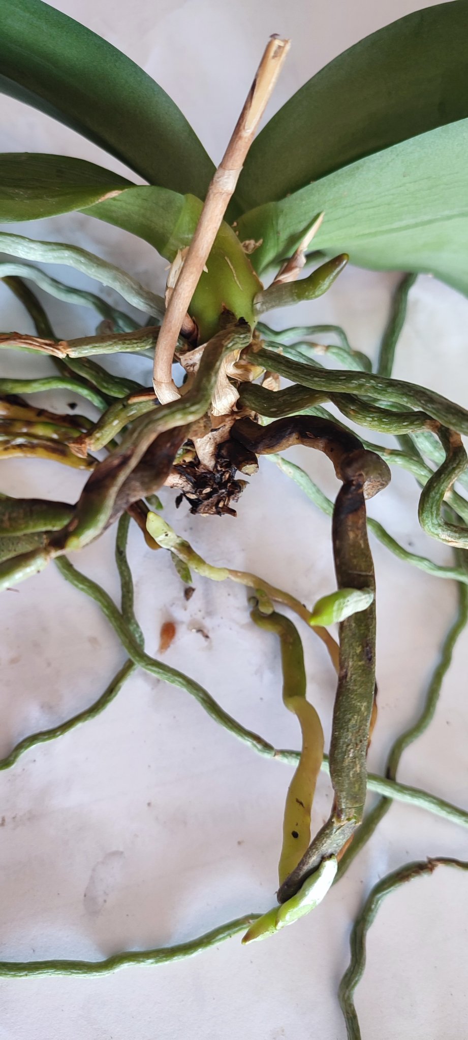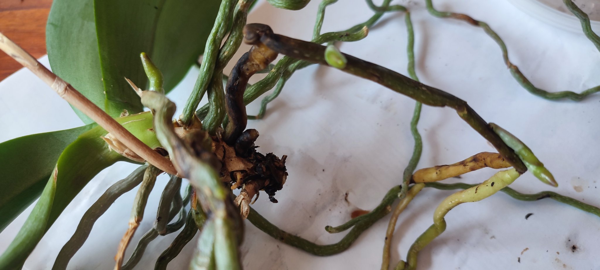 На снимка е трудно да се прецени, ако в основата на корените наистина е черно, е гъбично заболяване. Точно това е много често срещано, ако се загледаш и в магазина доста са така. От моя опит - живеят си и с него с години, и цъфтят даже, и в един момент се гътват внезапно. Но аз не лекувам, която оцелее.