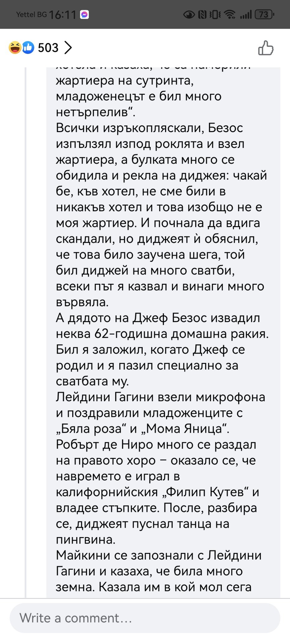 Диджеят обявил по микрофона, че днес е много важен ден и призовал кума Илон Мъск да държи сватбената си реч. Речта била много хубава и всички ръкопляскали, а свекървата баба Безос даже се просълзила и казала: „тя нашта се видя, важното е младите да се обичат, пък ний ще помагаме с квото можем“.