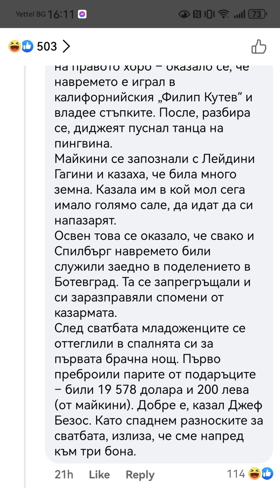 После, както си е обичаят, Илон Мъск играл за пилето, нали е кум. След танца с пилето дошъл ред на свалянето на жартиера на булката. Та влязъл Джеф Безос отдолу под роклята, а ония дърти пергиши Робърт де Ниро, Стивън Спилбърг и Джордж Клуни се скъсали да се хилят и да подхвърлят просташки коментари. И по едно време диджеят извадил от джоба си един жартиер и рекъл: „току-що ми се обадиха от рецепцията на хотела и казаха, че са намерили жартиера на сутринта, младоженецът е бил много нетърпелив“.