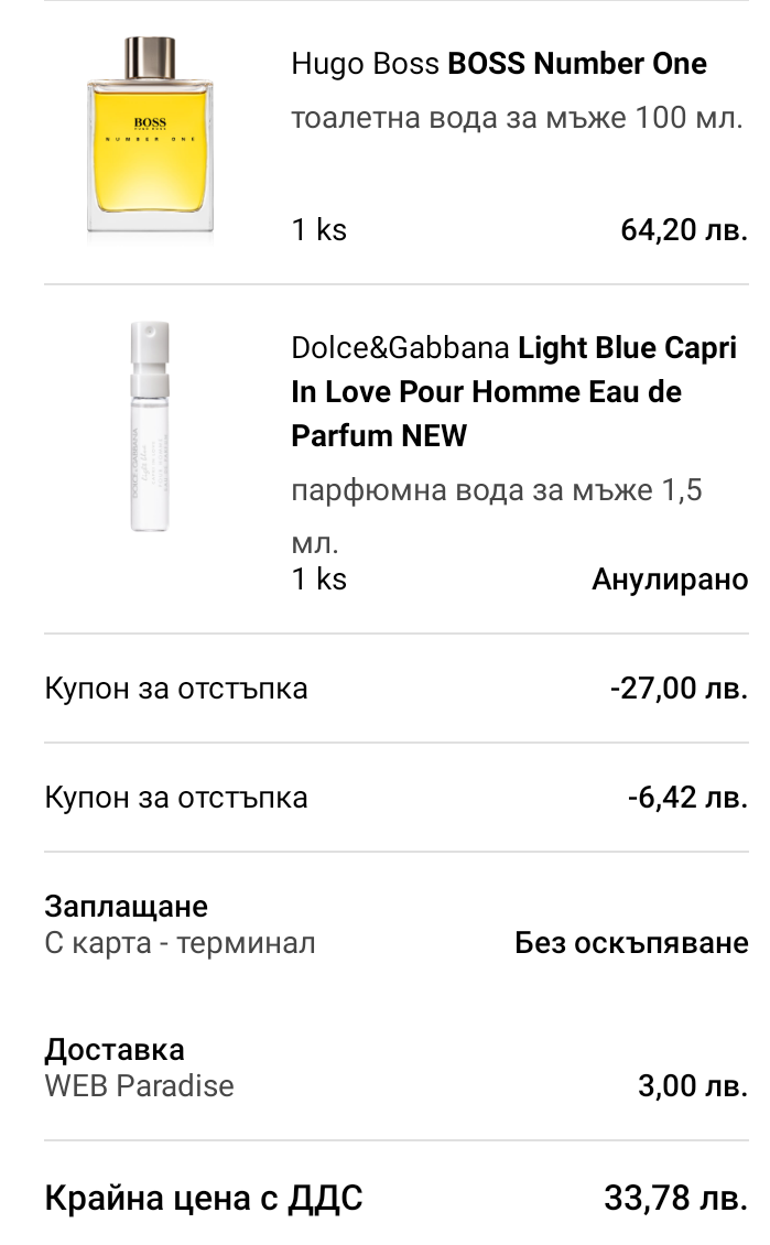 Не съм поръчвала парфюм от Озон, а книга. Коректен търговец. Доставиха безплатно до магазина им в Галерия Бургас.