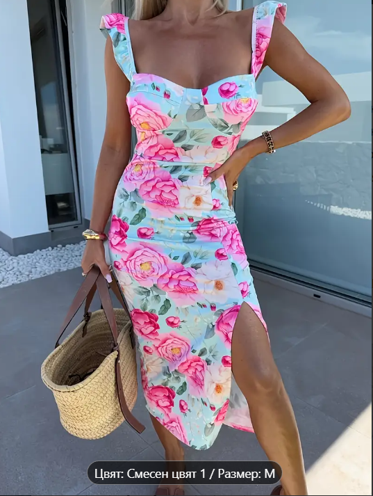 Рокля на цветя. Същия модел като горната, но от друг търговец. Размер М. Става ми. Хубава е, но няма да хареса на някого, който не обича шаренко. На тен стои супер, точно като на снимката е.
