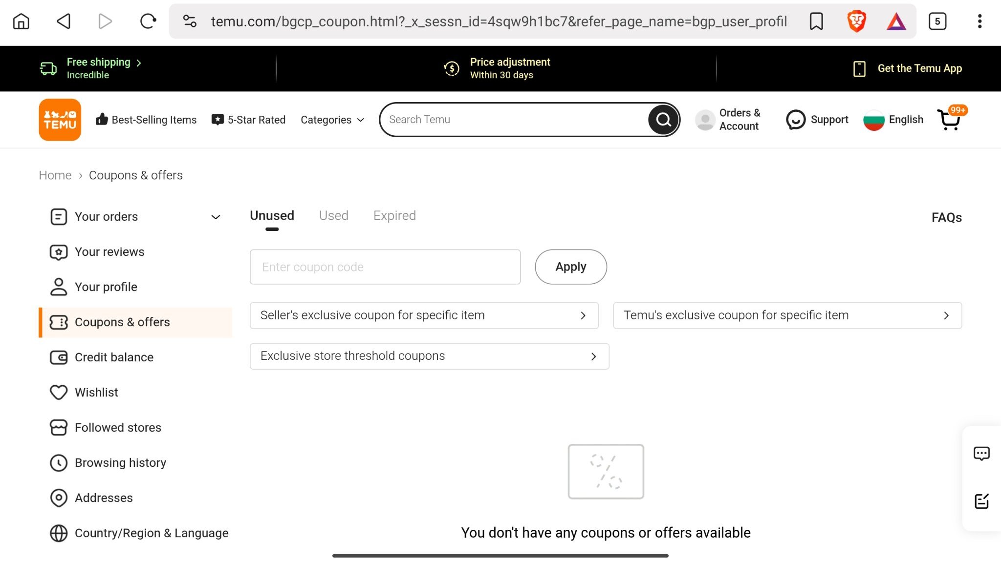 Оферти, каквито и да било, през профила в сайта нямам. Само в мобилното приложение. Купони, взети от мобилното, мога да ползвам при поръчка, пусната през профила в сайта, но първоначално взимане на самите купони - само през приложението.