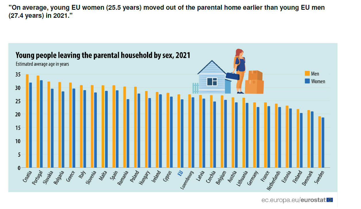 Не е само в България така. В цяла Европа почти се изнасят след 25 години, като мъжете по-късно. Картинката е стара, днес може и да се е вдигнала възрастта.