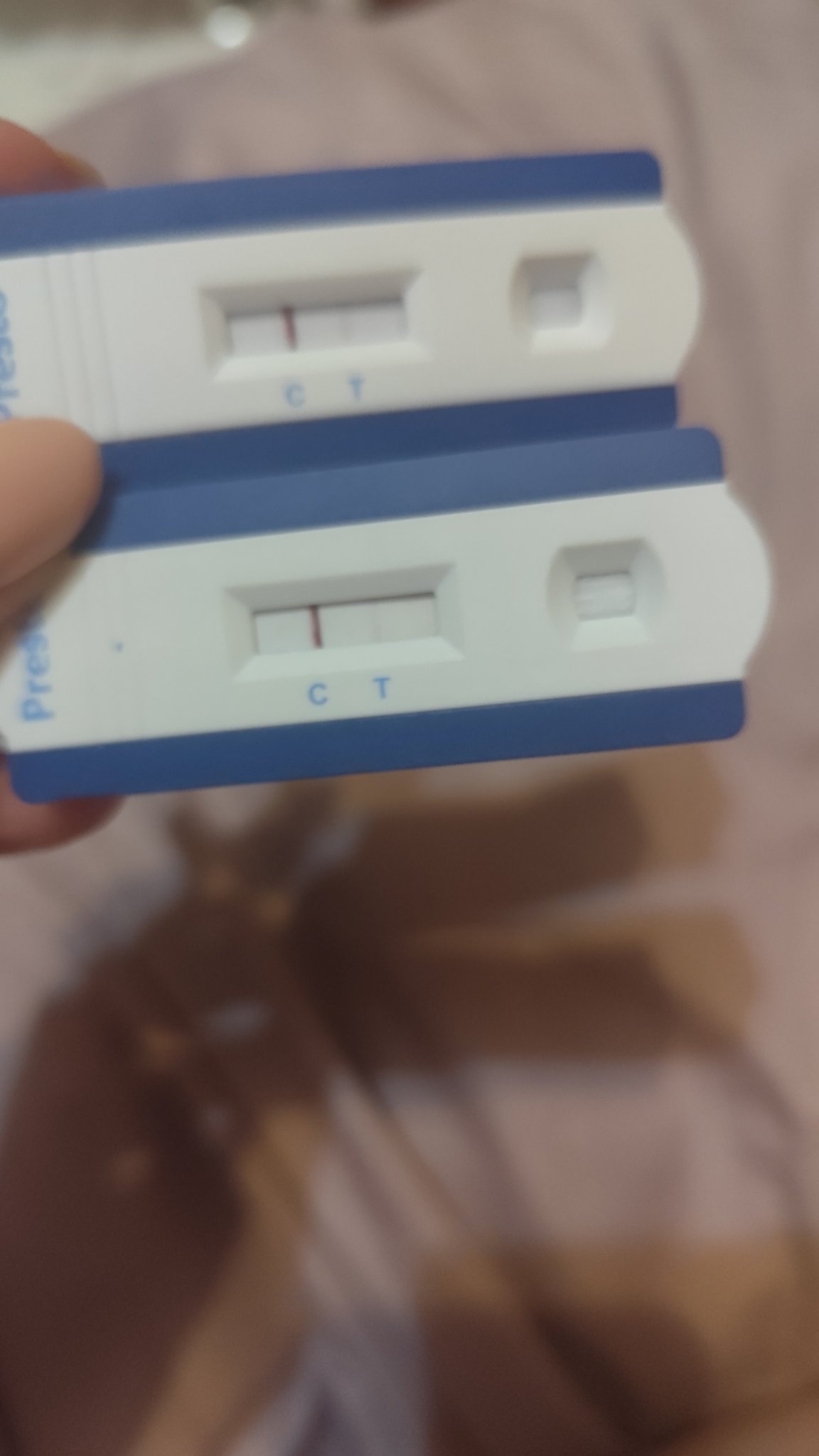 На снимка се вижда много бледо, пък и са бледи, но ги има. Само да уточня, че още не съм със закъснял цикъл. Направих ги, защото имах някаква интуиция и сега съм още по-объркана.