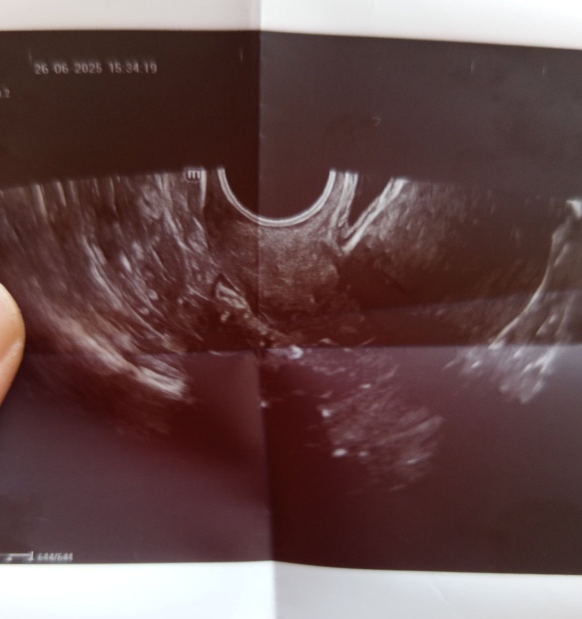 Здравейте пак! Преди 2 дена бях на лекар и докторката установи че има бременност, но прекалено е рано все още да се види около плоден сак, и ме извика отново днес. Днес също отидох със закъснение вече 6 дена, когато трябва да се вижда. По нейните думи странно около плоден сак няма, но според мен на снимката сякаш има. А пък аз определено не разбирам от ехографски снимки. Ще може ли и вие да споделите мнение. Вика ме отново в понеделник.