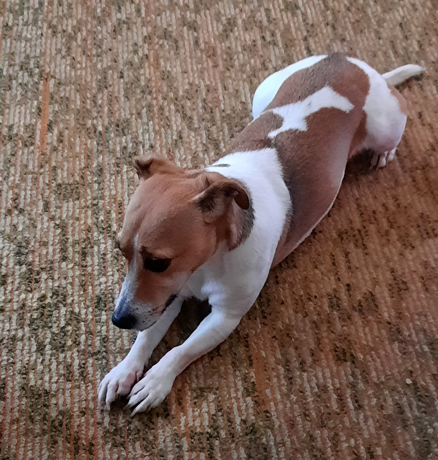 Ох, много се смея сама в офиса: на снимката Евчето е като на заколение - аха, аха си чака гилотината да падне. SmileySmileySmileySatisfied Вчера, покрай дискусията за второ куче в семейството се сетих, че Ева не се е явявала скоро и тя днес се представи в пълен блясък и ново кльощаво дупе.