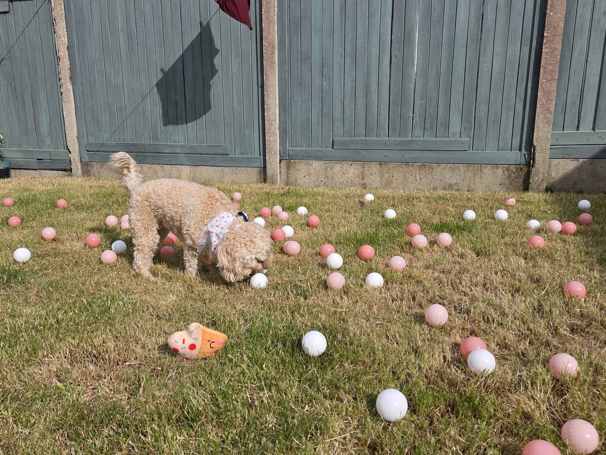 Играхме в градина с любимите топки и сега полегна да се охлади и да почине малко. Във Вторник ще празнуваме с нейните приятелчета в парка.