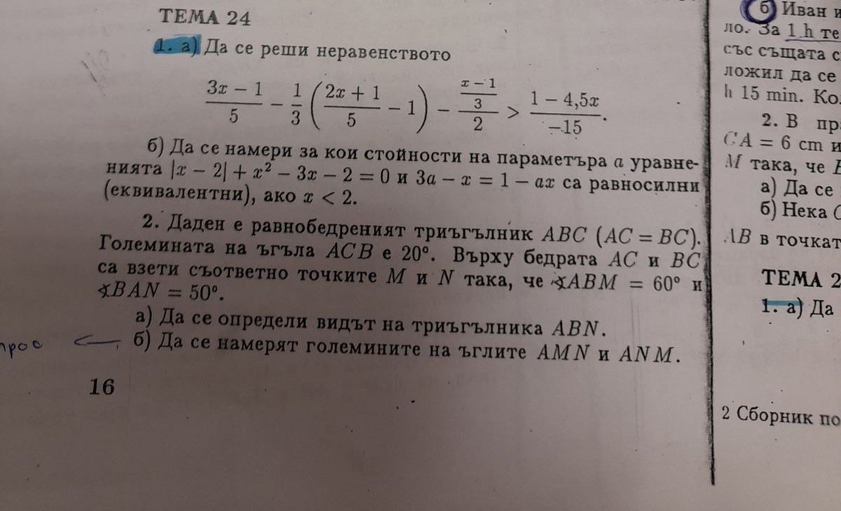 Видях в домашното му подобна задача, останала е нерешена тази седмица. Тъкмо навреме, днес нали ще търся такива, да обясня принципа набързо 😄. Може ли математиците тук да потвърдите това с допълване до равностранен триъгълник ли се решава, или има и друг начин. Виждам, че се е мъчил над нея, доста е драскал и налучквал някакви ъгли, но не я е измислил.