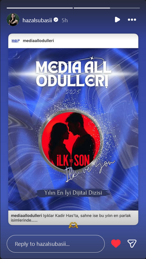 "Видео посланието, изпратено от нашия актьор Улаш Туна Астепе до церемонията по връчване на наградите на университета Кадир Хас, където нашият сериал "İlk ve Son“ спечели наградите за най-добър дигитален сериал и най-добра сериална двойка, въпреки че не можа да присъства поради натоварения си работен график. 👉❤️👈"