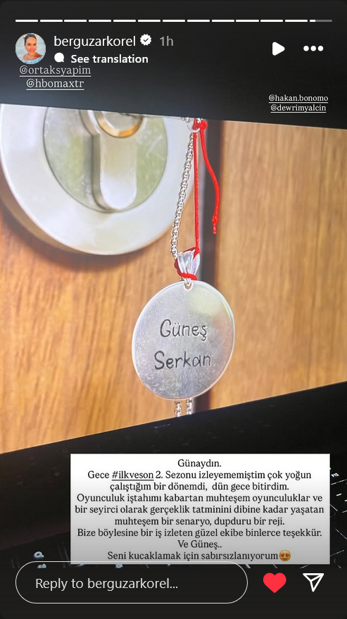 "Добро утро! Не съм гледала втори сезон на сериала "Първи и последен". Излезе в период, в който бях много заета. Но успях да го завърша снощи. Страхотна актьорска игра, страхотен сценарий и режисура, които като зрител ме накараха да почувствам, че историята е истинска. Огромни благодарности на екипа, който ни даде възможност да гледаме такъв сериал. И Гюнеш... Нямам търпение да те прегърна."