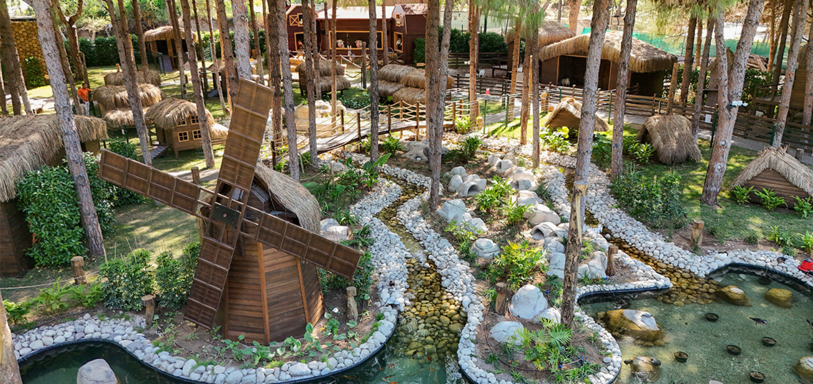 дом на зайци, кокошки, кози, мандаринки, костенурки, фазани, различни видове патици и риби.