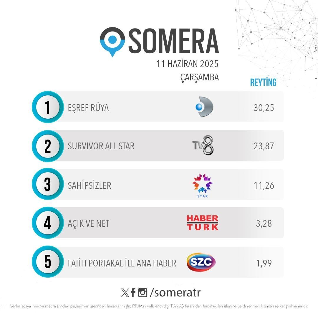 Eşref Rüya беше най-обсъжданият сериал в сряда през целия ден, с 55 400 публикации в социалните медии.