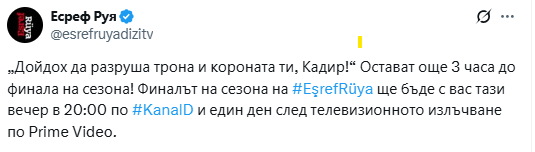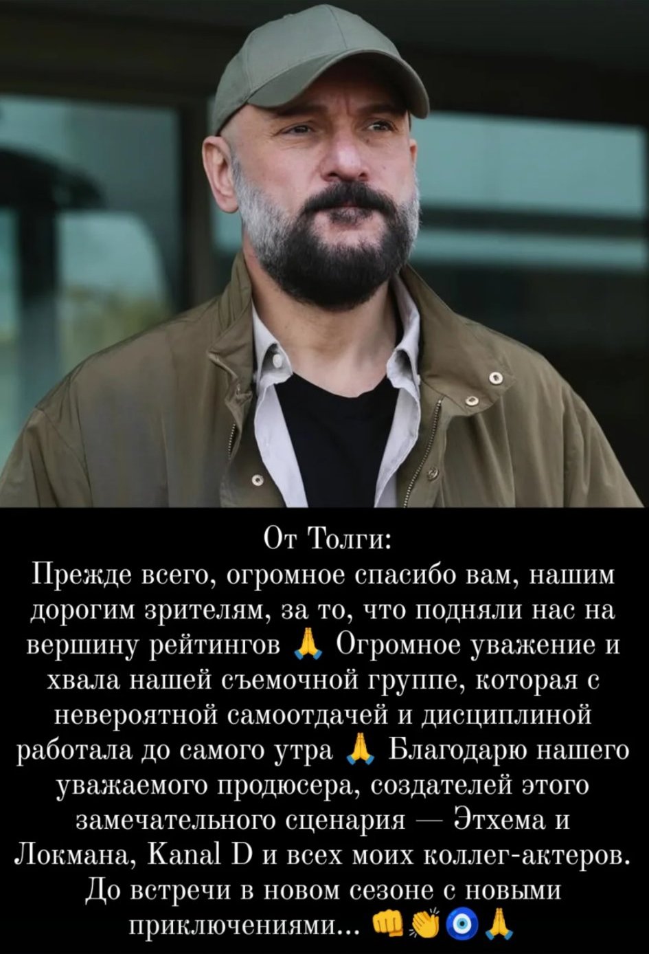 Първо, огромни благодарности на вас, нашите скъпи зрители, че ни издигнахте до върха на рейтингите. Огромен респект и похвала за нашия снимачен екип, който работи с невероятна отдаденост и дисциплина до ранните зори. Благодаря на нашия уважаван продуцент, на създателите на този прекрасен сценарий - Ethem и Lokman, Kanal D и всички мои колеги актьори. Ще се видим в новия сезон с нови приключения