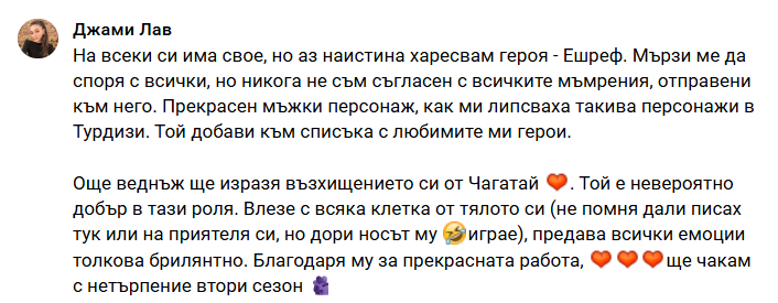 Аз ще чакам утре с български буквички и тогава ще коментирам.От това ,което споделихте виждам ,че Кадир постигна целта си,Чийдем постигна целта си и двамата живи ,здрави и доволни ,а Ешреф в затвора... в главата ми е мисълта "куц финал" ,ама преди да съдя ще го изгледам.