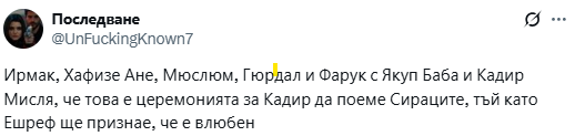 Много ми се иска да развият образа на Афра, защото до сега ми е буквално нулев. Но си права, че въпросите й бяха адекватни, не на глупачка. Най-вероятно целта да я съберат с Фарук е именно да ни покажат, че не е глупава, досега средата не е била нейната. С Фарук явно ще й доразвият образа.