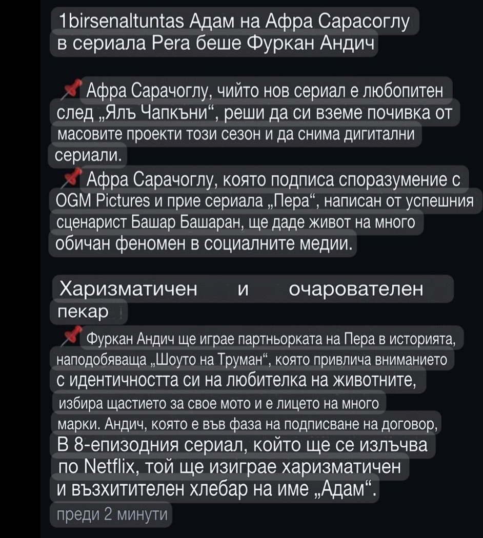 Ако наистина Фуркан Андъч и е партньор ще е интересно.Веднъж вече са играли заедно и да си призная бяха по-добра двойка от Афра и Толга в "Лошо момче".Харесвам много Фуркан и наистина бяха много добри с Афра в "Децата на сестрите",но там тя засенчи всички с играта,която направи.Не знам как го изигра този толкова труден образ,но още тогава бях възхитена от нея.Много добре им се получи и с Фуркан,само не разбрах защо го изкараха от последните епизоди и затова не доизгледах сериала.Както и да е.Фуркан и Афра са по-добрата комбинация от Афра и Толга в "Лошо момче".Освен това вече и двамата са по-опитни като актьори и наистина ще се получи добре.Остава и сценария да е добър и това вече ще е гаранция за успех.Да си призная не съм гледала "Шоуто на Труман" защото никак не харесвам Джим Кери,но разбрах,че сценариста на "Пера" е написал сценария на "Великолепния тандем"с Керем Бюрсин и Ибрахим Челиккол,който наскоро изгледах и е римейк на "Танго и Кеш".Много добре му се е получило,та се надявам и това да му се получи.