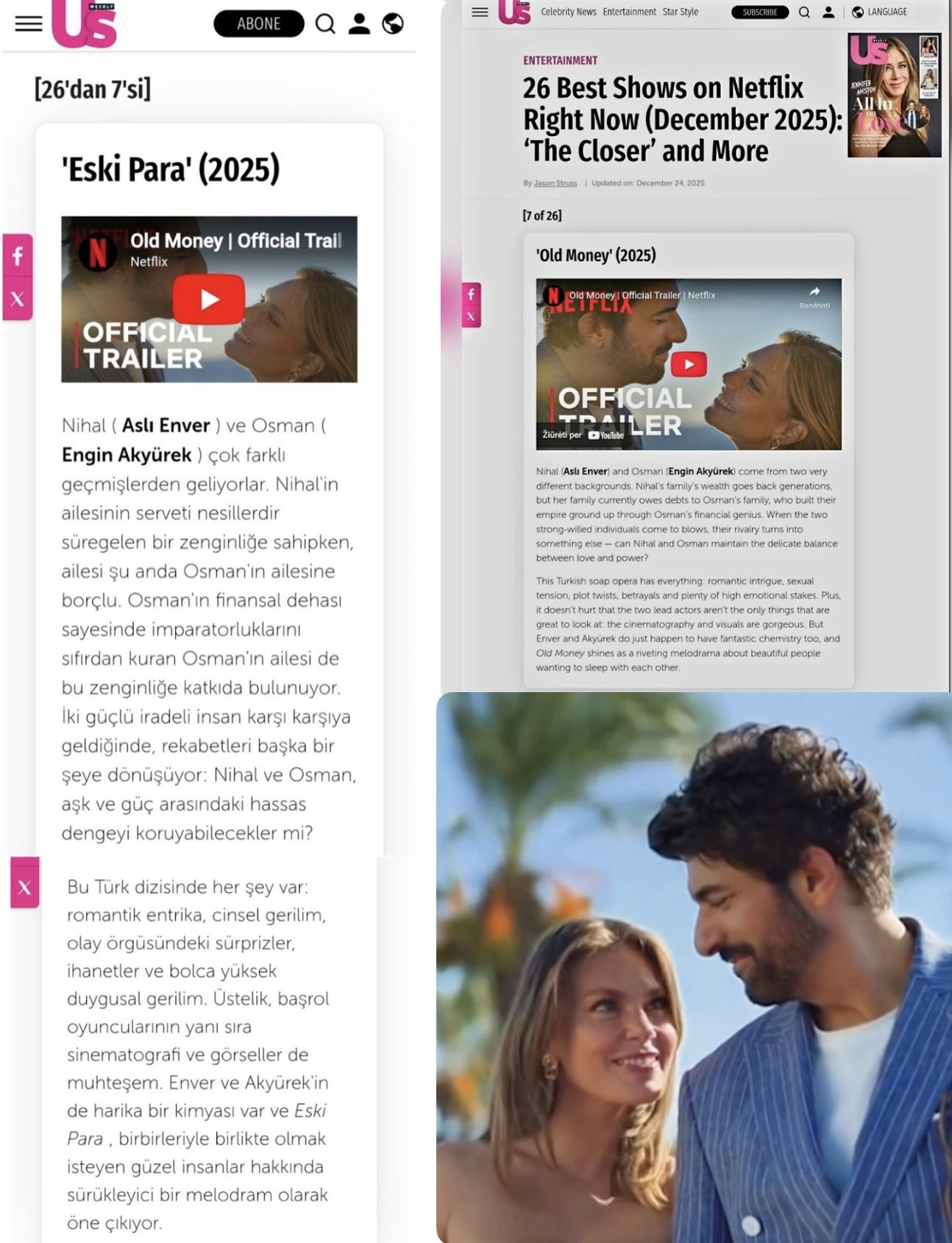 Едно от най-големите популярни развлекателни списания в САЩ, US WEEKLY, публикува статия, озаглавена „26-те най-добри сериала за гледане в Netflix в момента“. Сериалът „Enfes Bir Akşam“ / „Възхитителна вечер“ (Old Money) с участието на Енгин Акюрек и Аслъ Енвер, зае 7-мо място, превръщайки се