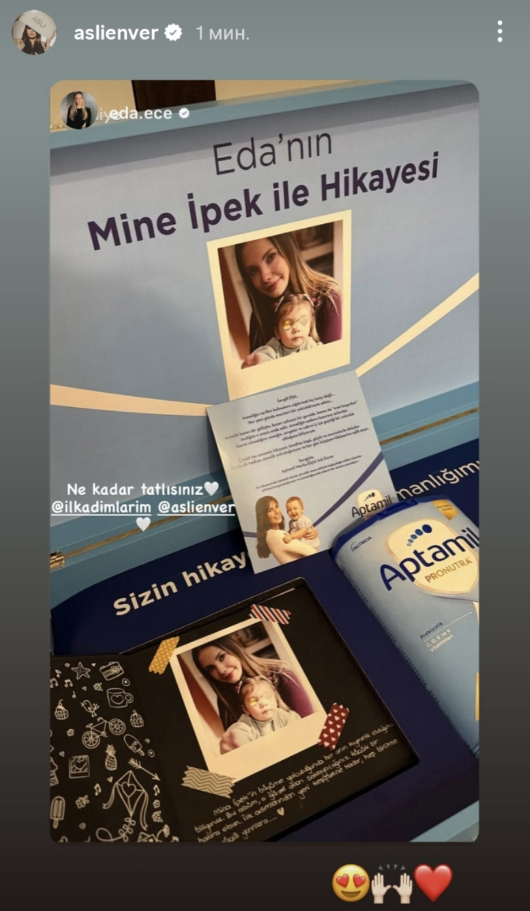 🆕 Аслъ публикува отново публикация от Еда Едже, която сподели подарък от марката адаптирано мляко за кърмачета Aptamil, на която Аслъ е лице.
