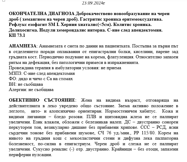 Здравейте, доц. Симонова! През 2024 г. ми правиха колоно- и гастроскопии заради продължителни симптоми. Качвам снимки с резултатите. Тогава лекуващият лекар не каза нищо конкретно след изписването като препоръка, а само без пържено, мазно, пикантно и спокойствие, както и терапията с Пулсет 20 мг. (Вероятно моите стомашно-чревни проблеми са вследствие от натрупан стрес, защото аз по принцип не ям гореспоменатите храни). Оттогава съм имала епизодични прояви на симптоми, но с терапия с пулсет 20 мг., Гавискон и лека диета се оправят нещата. От седмица-две имам отново симптоми, силно парене, чак и устните и езикът ме парят, направо "изгаряне" на хранопровода (ако мога така да се изразя) и през нощта се будех от този дискомфорт. Не знам дали е от храна раздразнението или от притеснения/стрес, но този път е непоносимо чак. Започнах пак терапия с Пулсет 20 мг. и Гавискон, ограничаване на определени храни, лягане наляво и т.н. Леко започна да се оправя положението. През месец май 2025 г. бях на профилактичен преглед и гастроентерологът (друг, не този, който ми прави манипулациите през 2024 г.) ми каза, че може би е добре да се направи отново гастроскопия, за да се види в какво състояние е хранопроводът и дали не е ерозирал или нещо такова беше. От друга страна преди година на баща ми му откриха рак на дебелото черво и го оперираха. Въпросът ми е трябва ли да повторя колоно- и гастроскопиите и в така описания случай на колко време трябва да се правят двете изследвания?! Предварително благодаря за отговора! Желая Ви здраве и късмет!