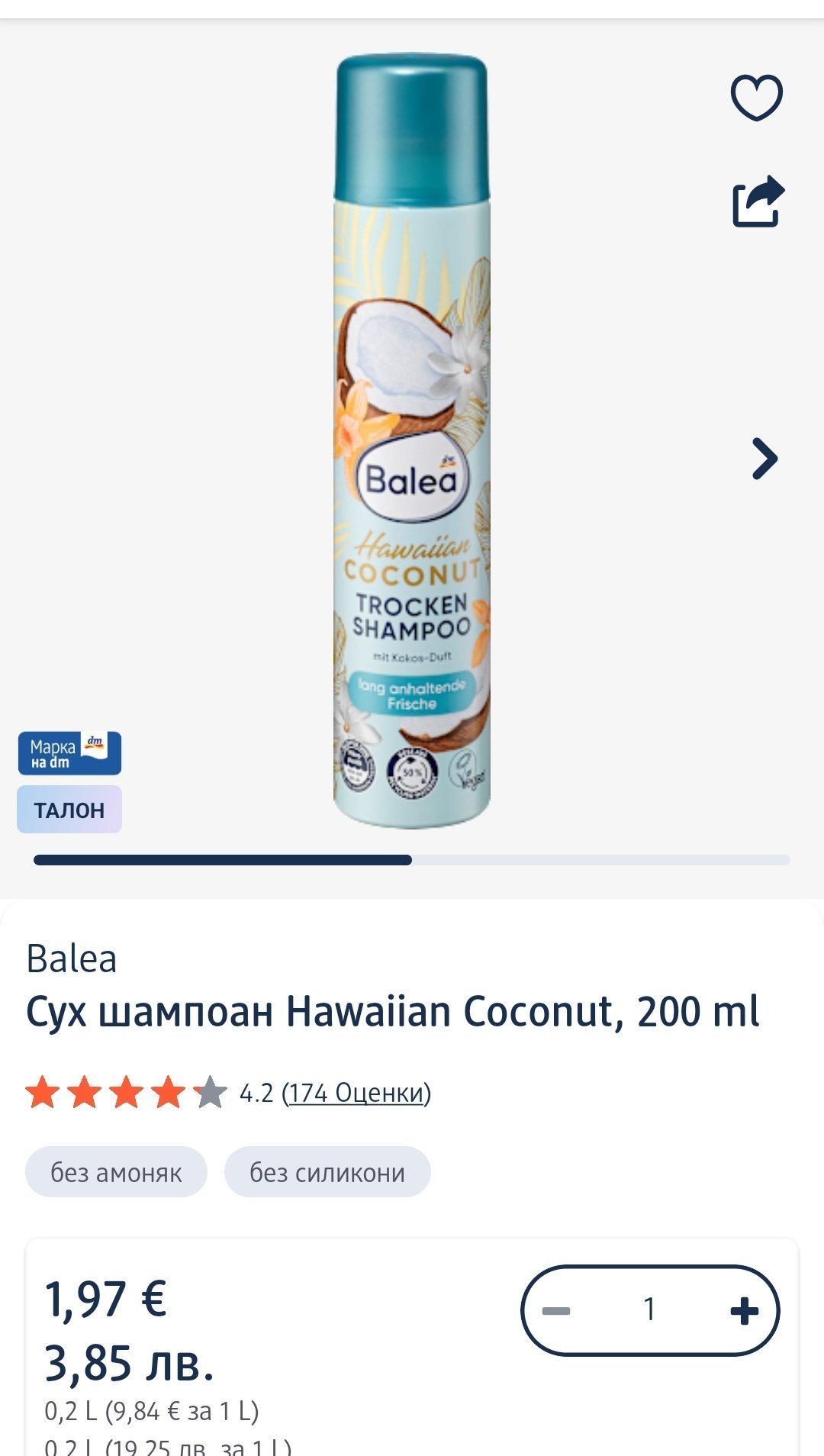 На мен не ми допаднаха сухите шампоани на Балеа. Трябва да пръскаш по много, защото трудно излиза съдържанието от спрея. И като ефект не ми харесаха. Най-хубавите си остават на Batiste - по-конкретно оригиналния. Даже до вчера имаше талон за 30% отстъпка.