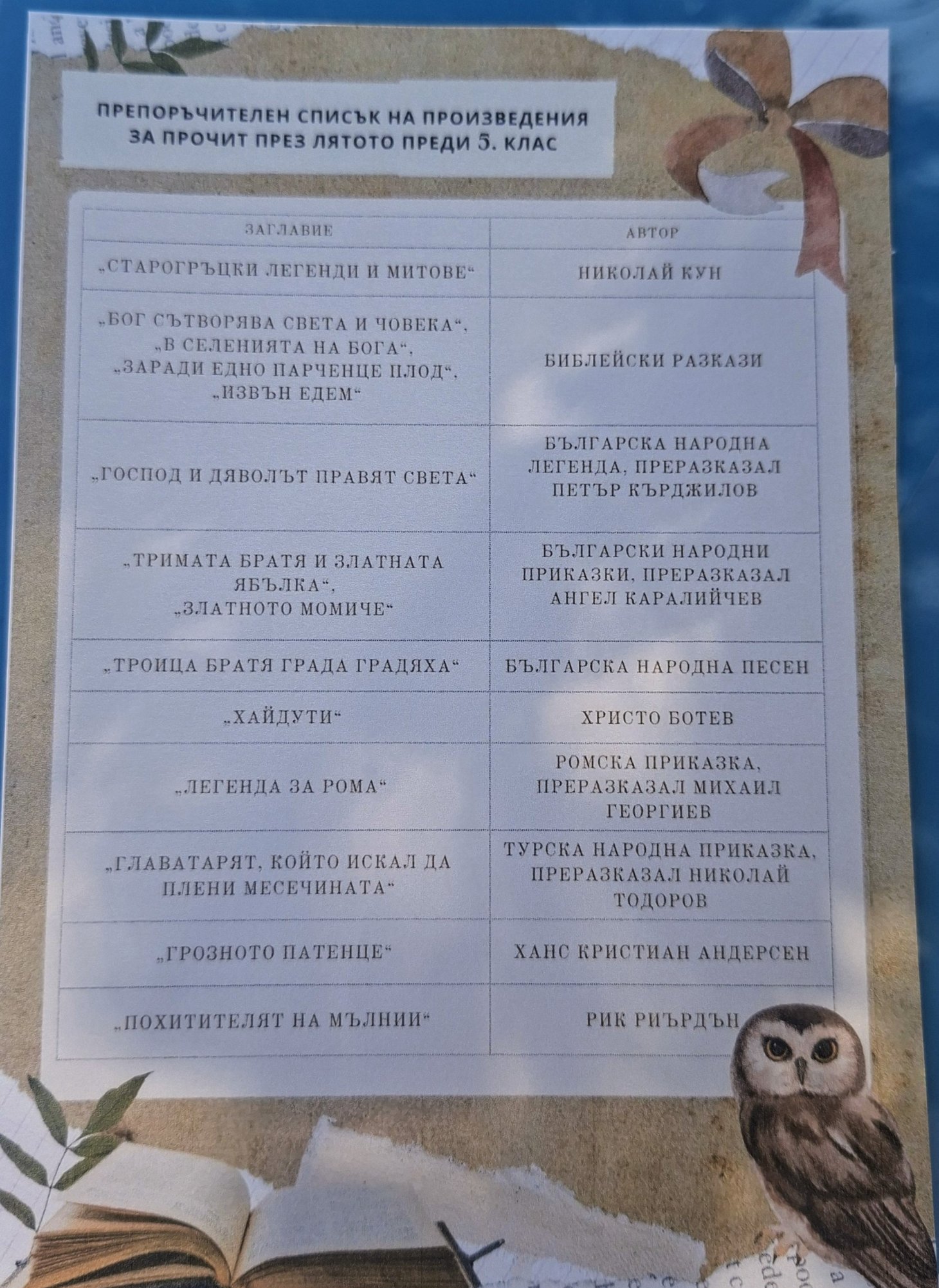 Така е. Програмата по литература първия срок е мама мия. Щерката загуби всякакъв интерес към литературата, а езиците са й "силната" страна. Дано учителката мине набързо през тези произведения, че нашата доста зацикли на библейската тема и отврати детето тотално. Съвет, ако приемаш. От тук нататък вземай христоматията с откъсите от произведенията и другото да чете каквото му е интересно. В шести клас учат две глави от "Под игото", една или две от "Принцът и просякът", от Джералд Даръл "Моето семейство и други животни", "Серафим" , "Братчетата на Гаврош" и не помня какво още. С "Под игото" не се разбра, но "Принцът и просякът" и Джералд Даръл я накарах да ми ги чете на глас целите, за да разбере и свърже откъсите. Вместо древногръцките митове и легенди, пробвай да пробуташ "Пърси Джаксън и боговете на Олимп" - много по-интересно и смилаемо.