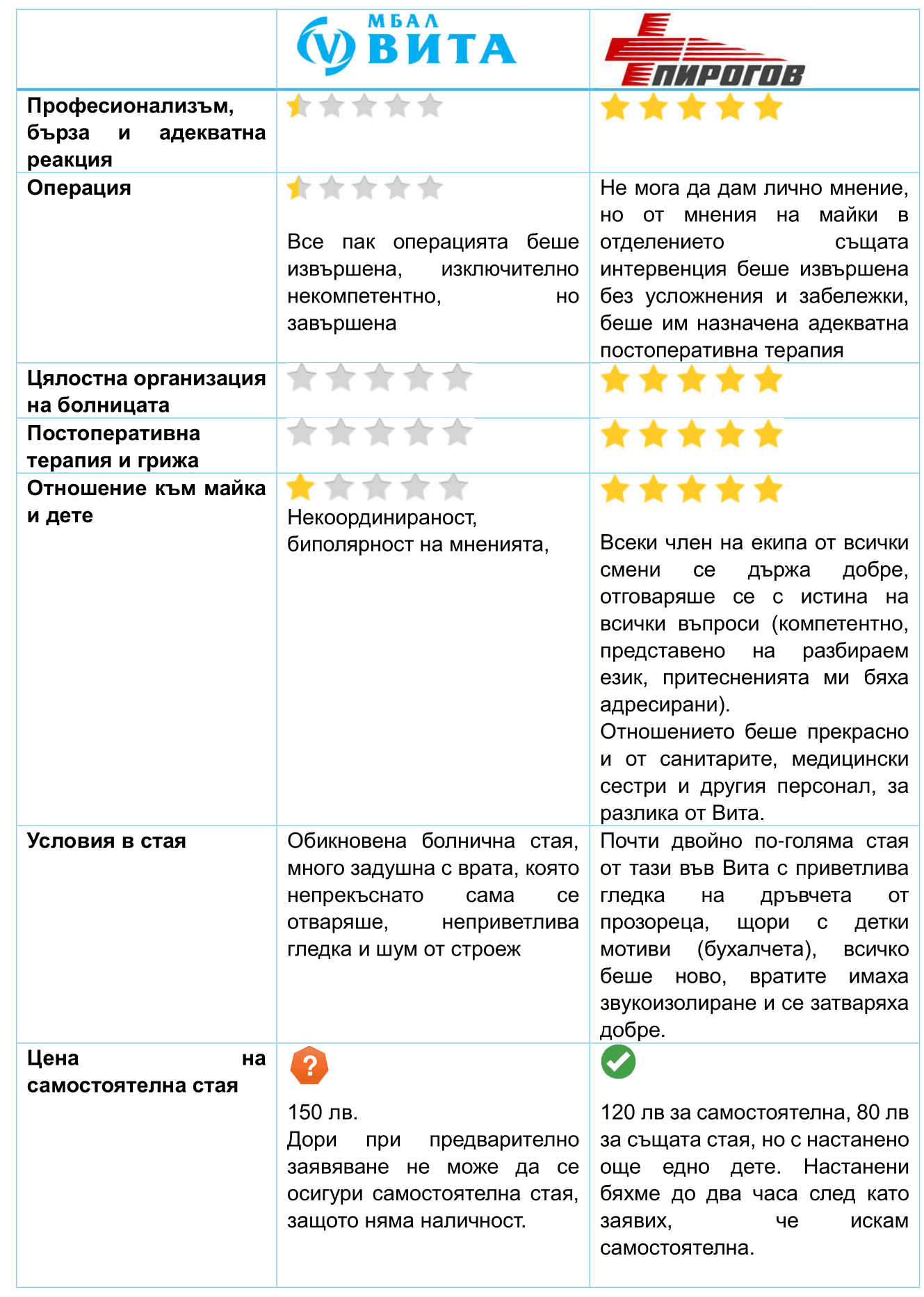 -> Лошо впечатление ми направи изказването във Вита на член на персонала: „Всички добри лекари от детското отделение в Пирогов са вече във Вита, в Пирогов няма останал един читав уролог.“ Изключително непрофесионално изказване, предвид, че конкретната сестра никога не е работила с екипа от доктори в Пирогов. За cравнение в Пирогов не чух такова непрофесионално изказване към Вита, въпреки очевадното недоглеждане в постоперативната грижа и непрофесионално извършената операция.