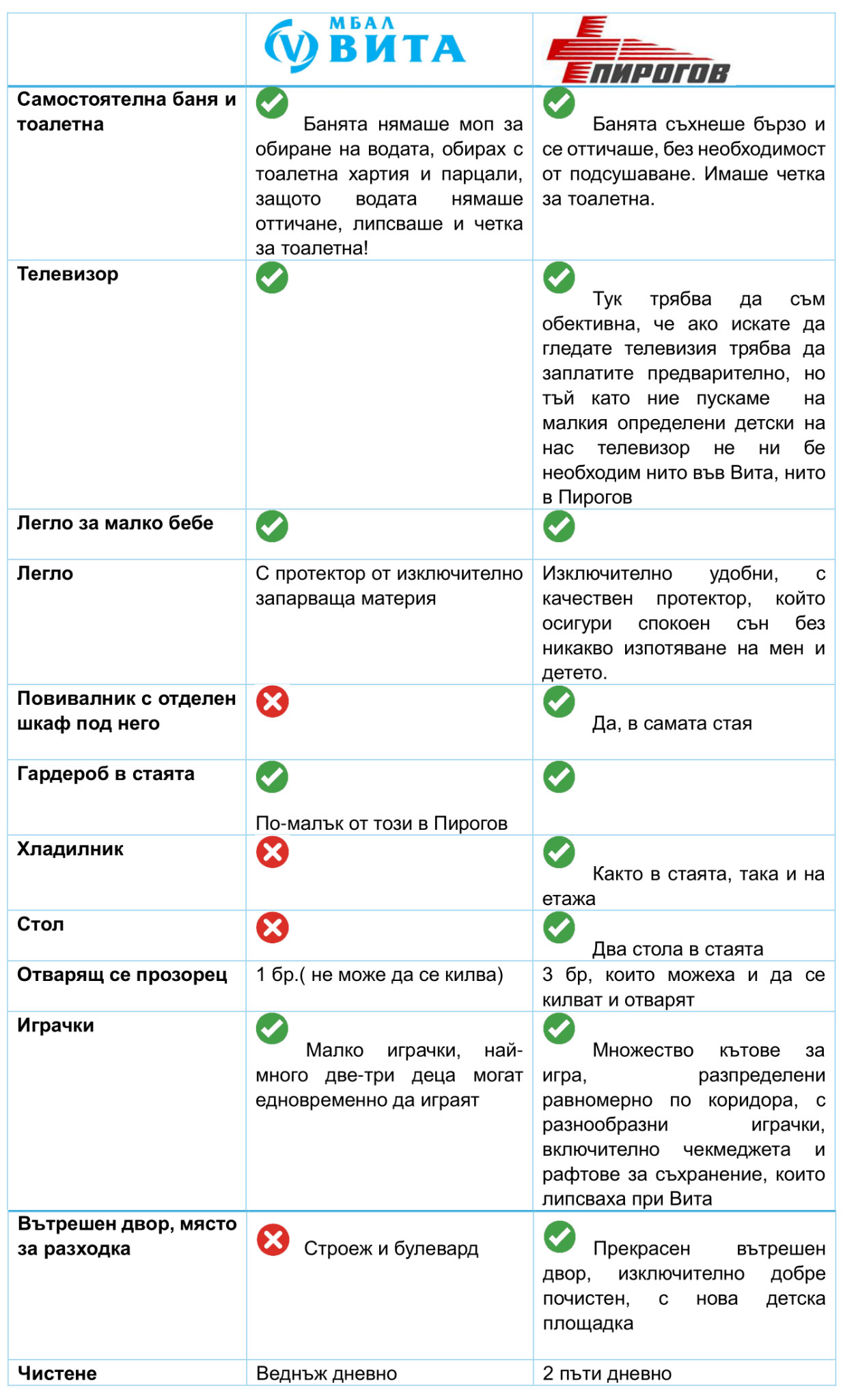 -> Температурата на децата в Пирогов се мереше тихо(докато детето спеше, без да се събужда) и нито веднъж не се сбърка мерена ли е или не(просто Пирогов има безупречна организация). Докато във Вита се нахлу в 21:30 часа за мерене на температура, въпреки, че и двете деца вече спяха. Съответно се събудиха. След 30 мин пак се нахлу и без никакво съобразяване се викаше да измерим температурата. След като им казахме, че е мерена излязоха от стаята, но децата за втори път бяха събудени.