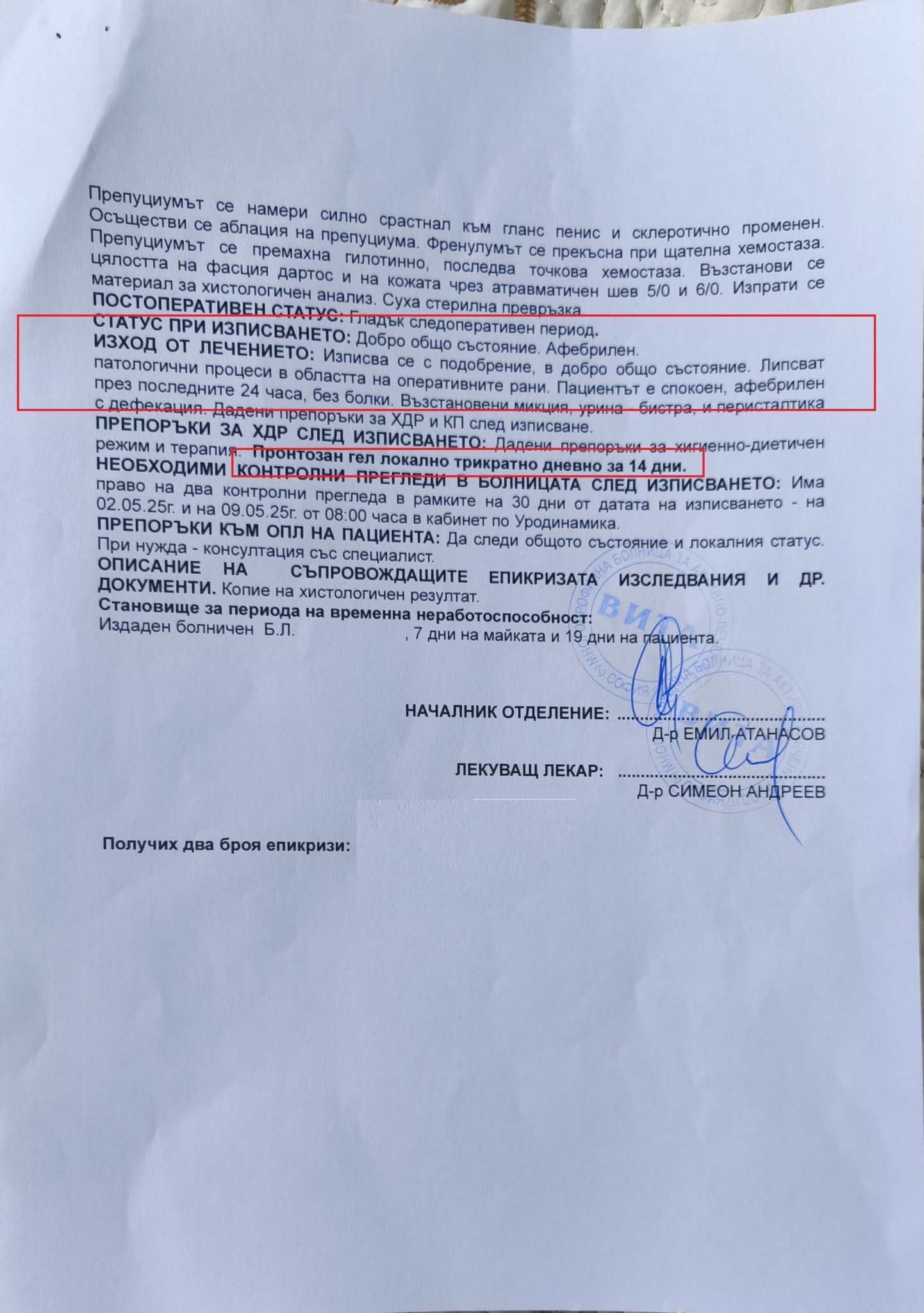 Започнахме да проучваме мнения по форуми, намерих и позната, на която момченцето беше с направена доста сложна операция по обрязване и цялостна реконструкция на члена и тя ми потвърди, че извършилия операцията доктор Иван Александър Георгиев е добър специалист. Най-вероятно операцията е била извършена от или под наблюдението на д-р Атанасаов. Нямам друго обяснение.
