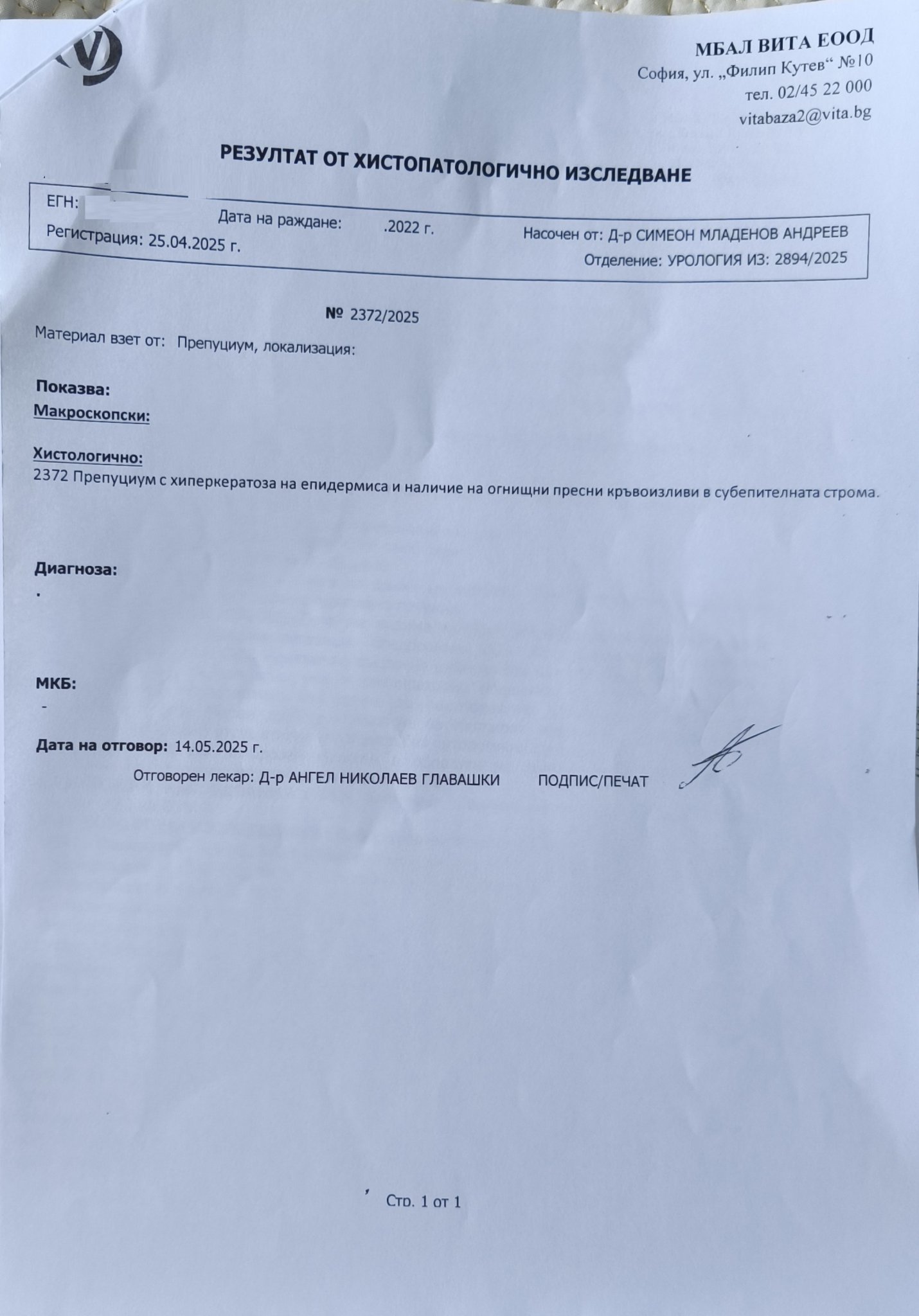 Резултатът от тази толкова „обстойна“ хистология бе един ред: 2372 Препуциум с хиперкератоза на епидермиса и наличие на огнищни пресни кръвоизливи в субепителната строма.