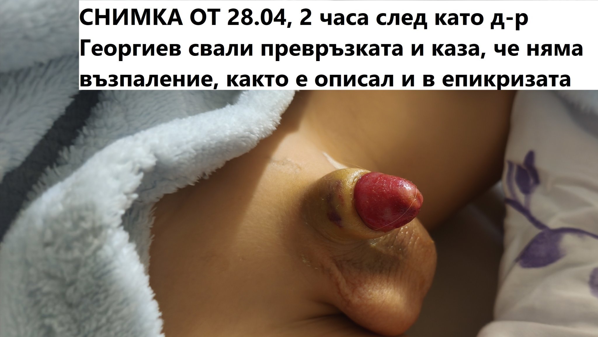 Вторник сутринта раната на главичката ОЧЕВАДНО беше инфектирана, направих снимка, на която ясно се виждаше инфекцията и я изпратих на д-р Георгиев с текст, че според мен има инфекция и какво да правим. Той заяви: "Не смятам, че има инфекция, ако искате елате към 13 часа, за да ви покажа как да мажете".