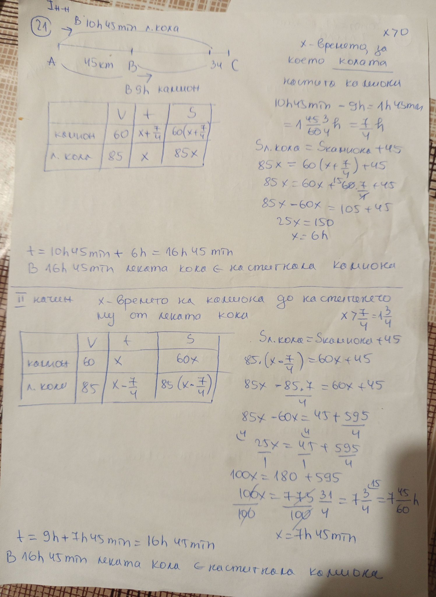 По-удобно е да се означава с х това което питат-тук питат в колко паса леката кола настига камиона,значи х е времето на леката кола.