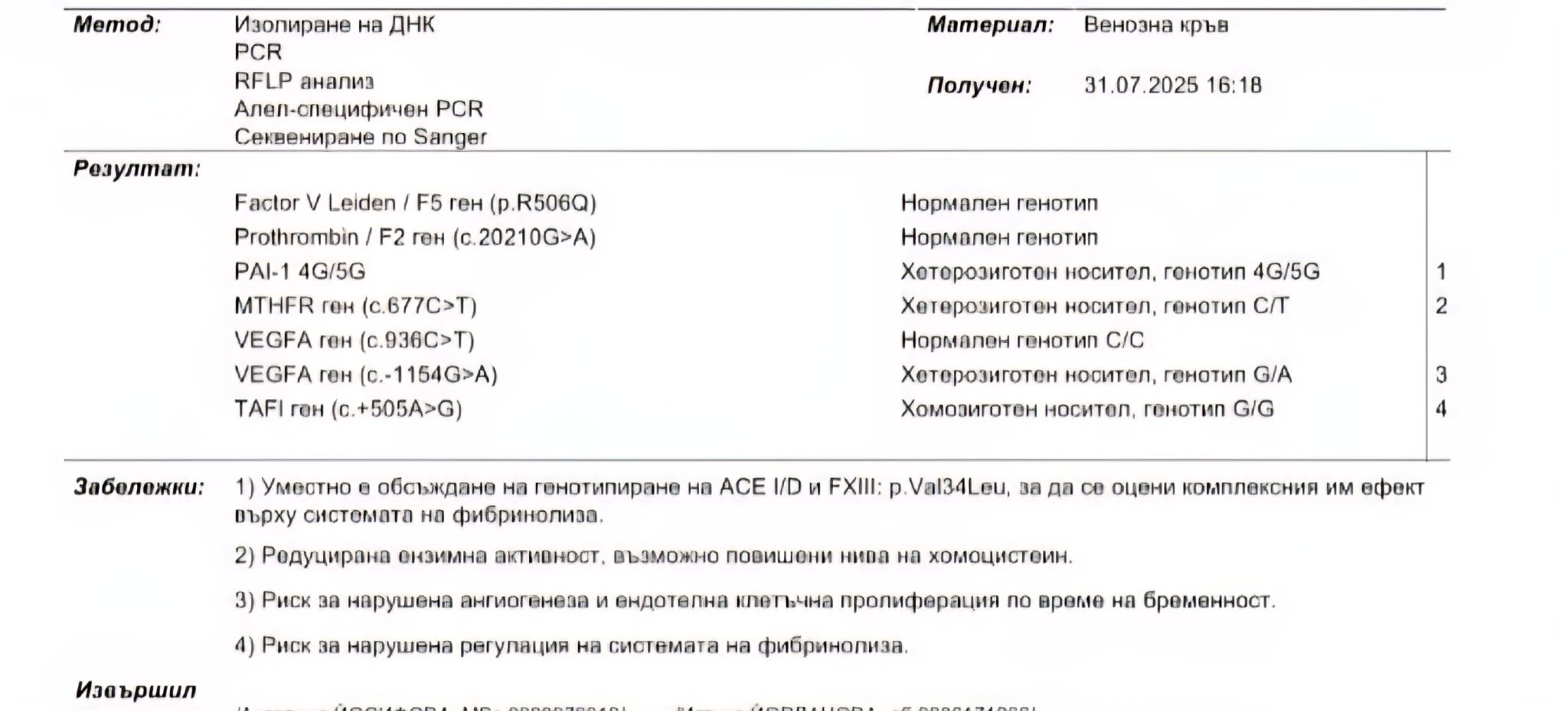 Мутацията в PAI предполага вероятност за проблем във фибринолизата (разграждането на тромбчета), тълкува се заедно с резултат от изследването на още 2 фактора - ACE и Factor 13.