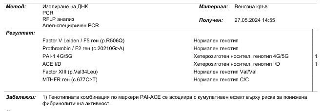 Мутацията е PAI-1 4G/5G Хетерозиготен носител, генотип 4G/5G