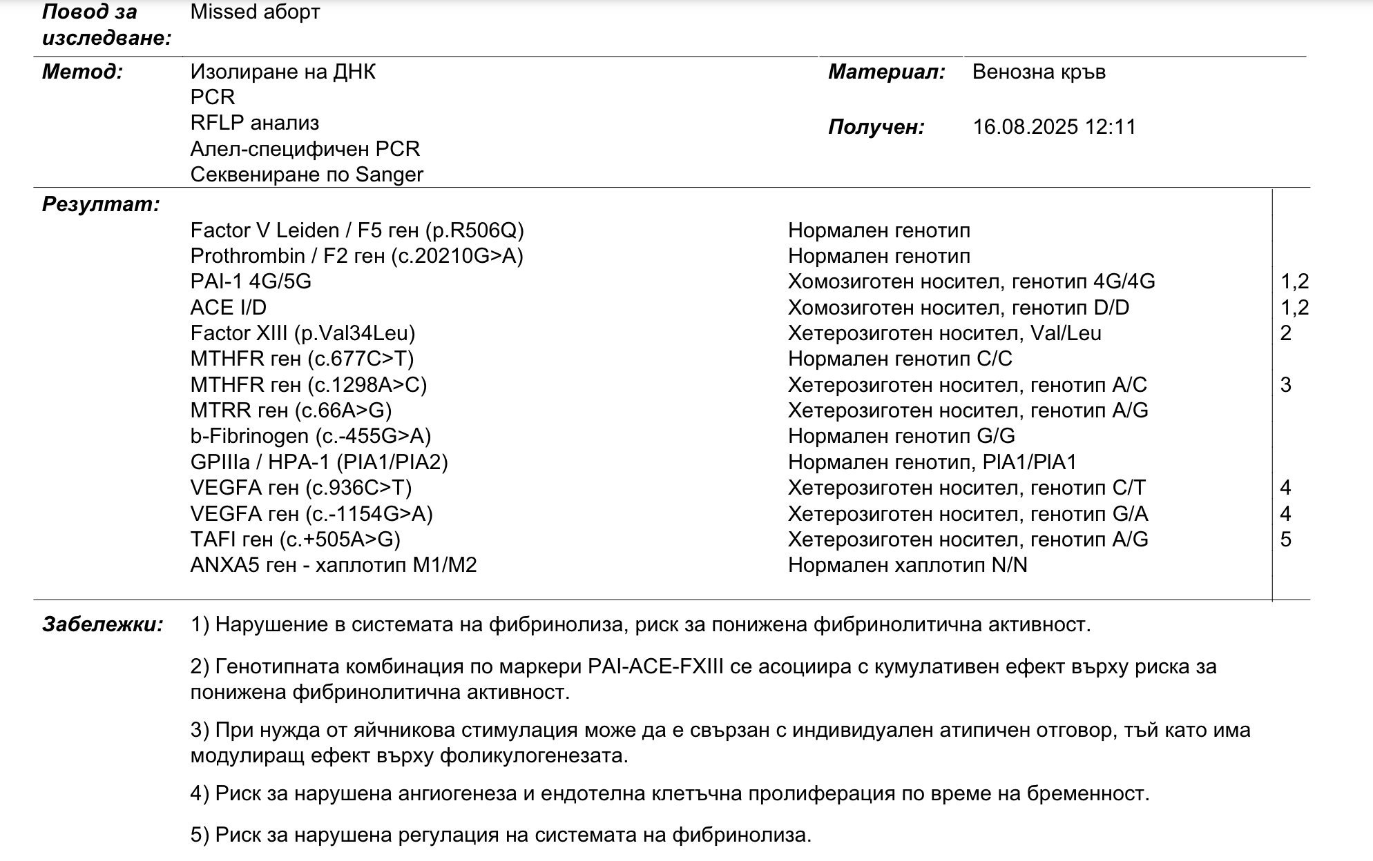 Здравейте, след мисед, биохимична бременност и втори мисед,( от който още се възстановявам) в рамките на 10 месеца стигнах до изследванията за тромбофилия.