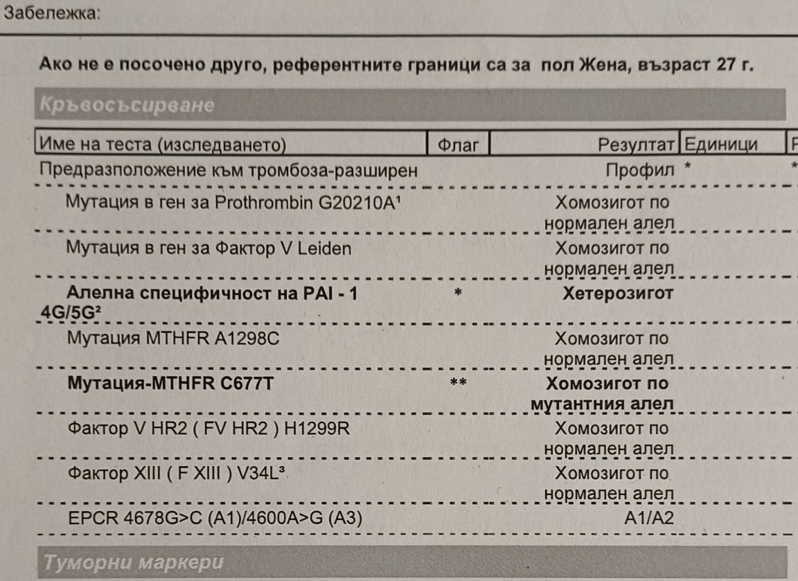 Пуснах генетичния пакет на лаборатория Synevo, но тези които изброих светят в четвено. Останали за отбелязани като отрицателни.
