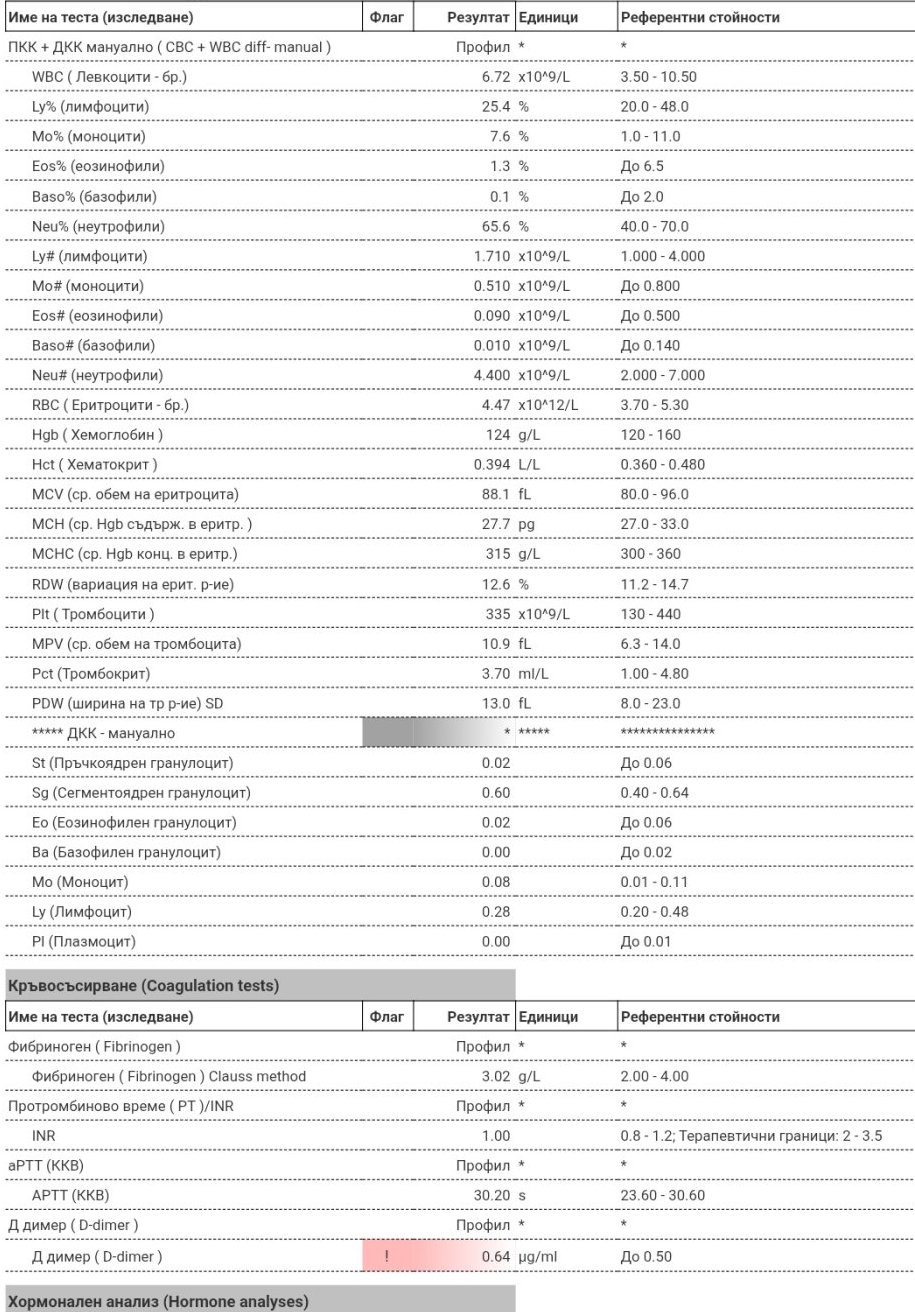Здравейте!Може ли малко споделен опит.Втора бременност ми е ,при първата си направих тест за тромбофилия и докито каза ,че всичко е 6.Не съм пила нищо за разреждане и стриктно следяхме показатели за кръвосъсирване.Всичко беше наред.Сега съм бременна отново ,8 седмица и при пускане на рутинните изследвания при D-dimer 0,64 доктора ми назначи наистина 2*1.Прилагам генетичното изследване и новите изследвания.