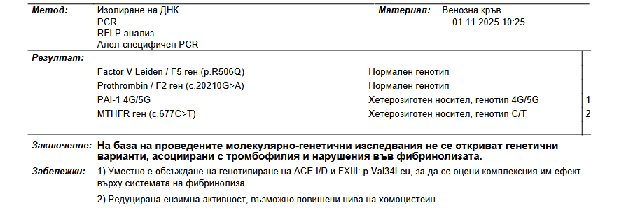 Хетерозиготната мутация по PAI пък се тълкува заедно с още 2 генетични фактора - ACE и Фактор 13.