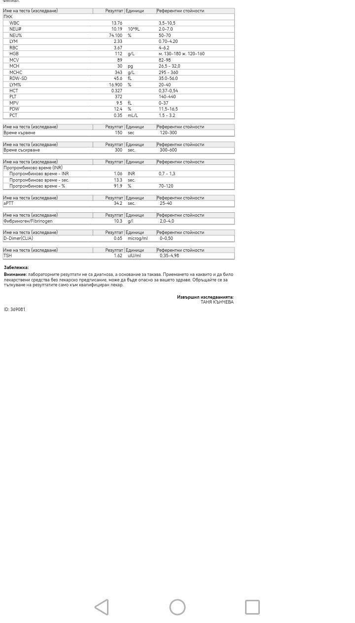 Днес пак пусках аптт в норми, малко нисък, но в норми, фибриноген в норми, д димер отново 5.45, а в друга лаборатория 4. АнтиХа 0.41.