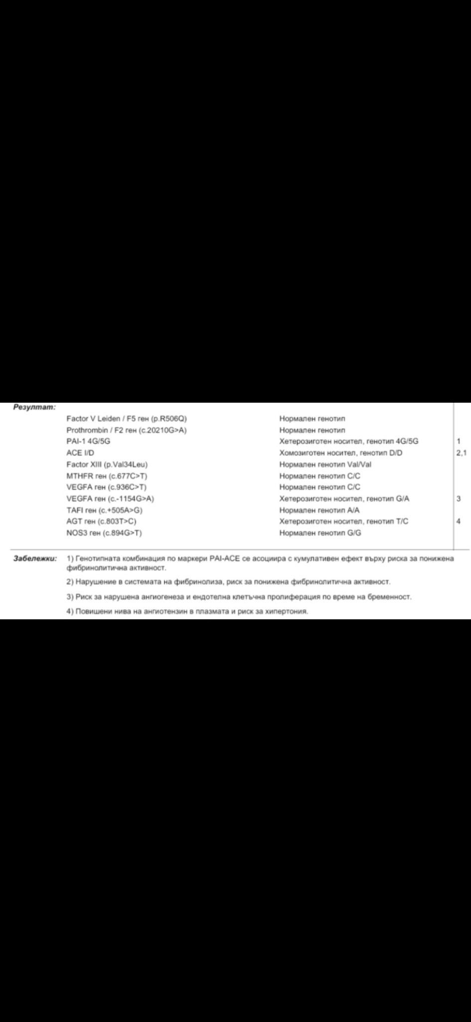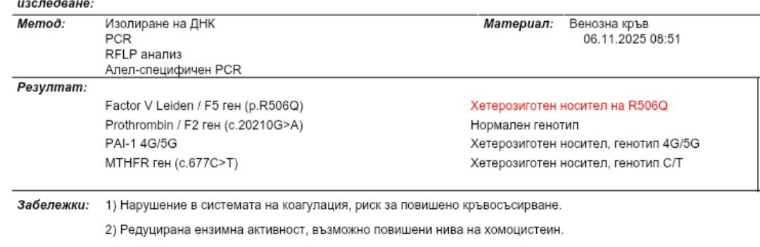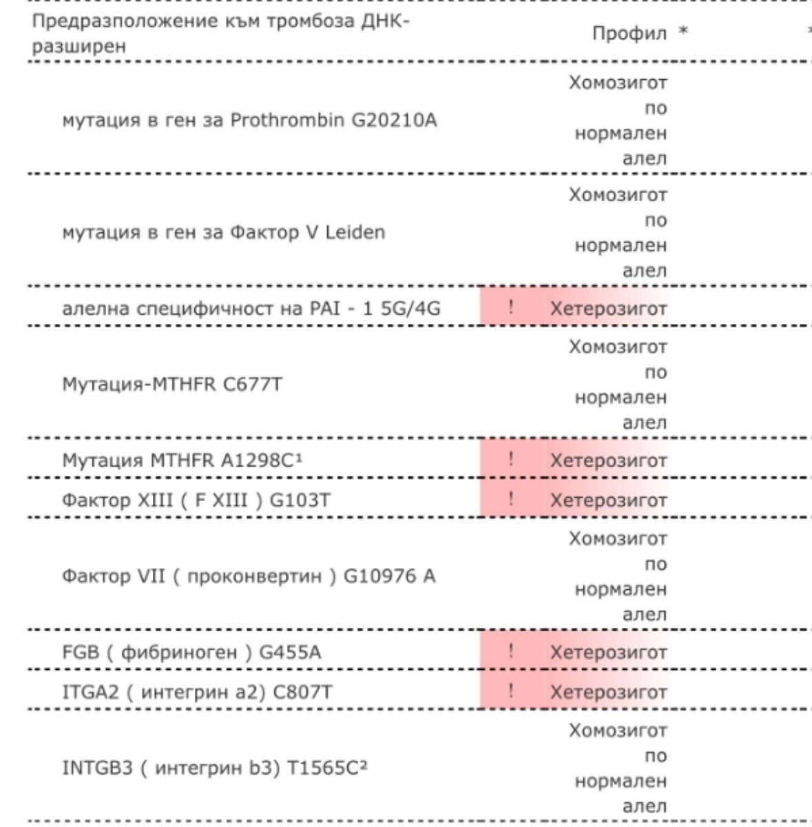 Имаш мутация по високорисков фактор V, свързан с повишено кръвосъсирване и тромбообразуване. Имаш и мутация в нискорисков фактор PAI, свързан с проблеми във фибринолизата (разграждането на тромбчета). И третата мутация е свързана с неусвояване на синтетични витамини от група Б.