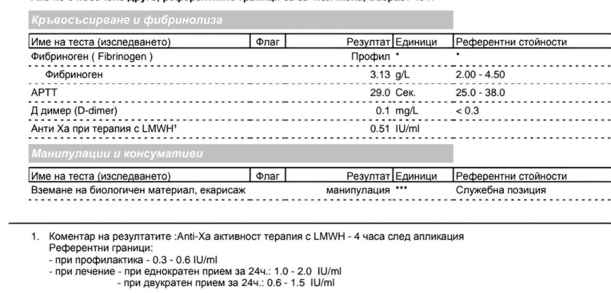 Здравейте, момичета. Моля за съвет. Преди една година загубих бебе в 30гс. На хистологията се установи стеснени кръвоносни съдове на плацентата. След преглед при д-р Тончев той ми назначи изследвания за тромбофилия и прикачвам резултатите по-надолу. Той ми каза при следващ положителен тест да започна нмх и да се чуем за последващи изследвания. След това бях на преглед при д-р Калчев и той ми даде рецепта за Клексан 0,4 при положитен резултат. Вчера си правих кръвен тест за бременност, който е положителен. Въпросът ми е дали да започна Клексан, докато ми дойде срещата с хематолог/гинеколог или да чакам първо преглед и насоки? Объркана и притеснена съм и не знам какво да правя... Благодаря