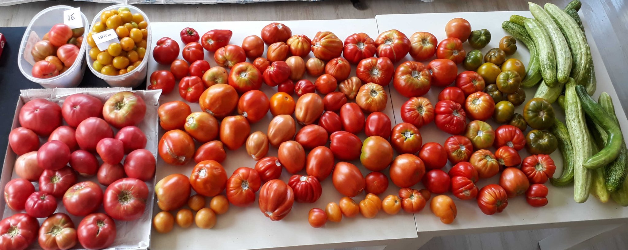 София ме питаше как е при мен с вирусите - малко се закрепиха нещата. Дали хитозанът действа не мога да кажа, защото не смея да проверя как би било ако не го използвам - внушила съм си че действа. В общи линии, грубо изчислено, мисля че вирусът ми отнема около 40% от реколтата - както от изкоренени растения, така и от дефектни плодове. Може би в идеалния вариант да са и повече, но и без вируси идеалният вариант рядко се получава. Иначе тази година реших да не използвам друго, освен НимАзал и Хитозан. Нимазалът освен инсектицид, има и фунгицидно действие, хитозанът за по-висока устойчивост срещу вирусите. Ето ми реколтата от този петък. На първата снимка се виждат и доматчетата с дефекти, които нарязвам за готвене.