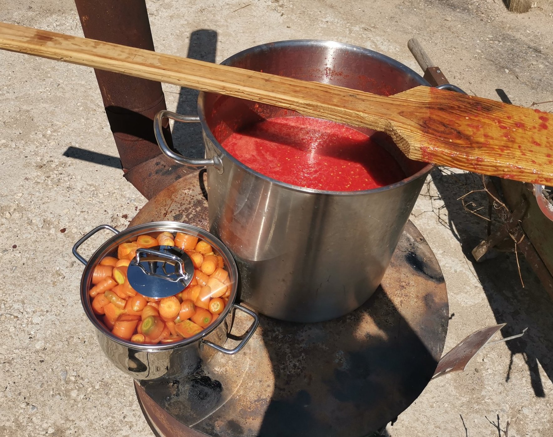 След това на 4 пъти с голямата тенджера на огъня приложихме трика с маркуча, от което сме много доволни и получихме гъсти домати. С това се занимаваше половинката, а през това време аз извадих и около 3 кг моркови, които почистих и сварих. В мазнина, около два литра олио задуших около 4 кг лук и близо половин кг чесън. Пасирах ги и накрая ги добавих към доматената смес, заедно с предварително пасиран босилек със зехтин и подправхи риган, черен пипер и сол. Захар нямаше нужда да слагам, защото бяха много добре узрели доматите и изобщо не киселееха, а и морковите и лука също дават леко сладост.