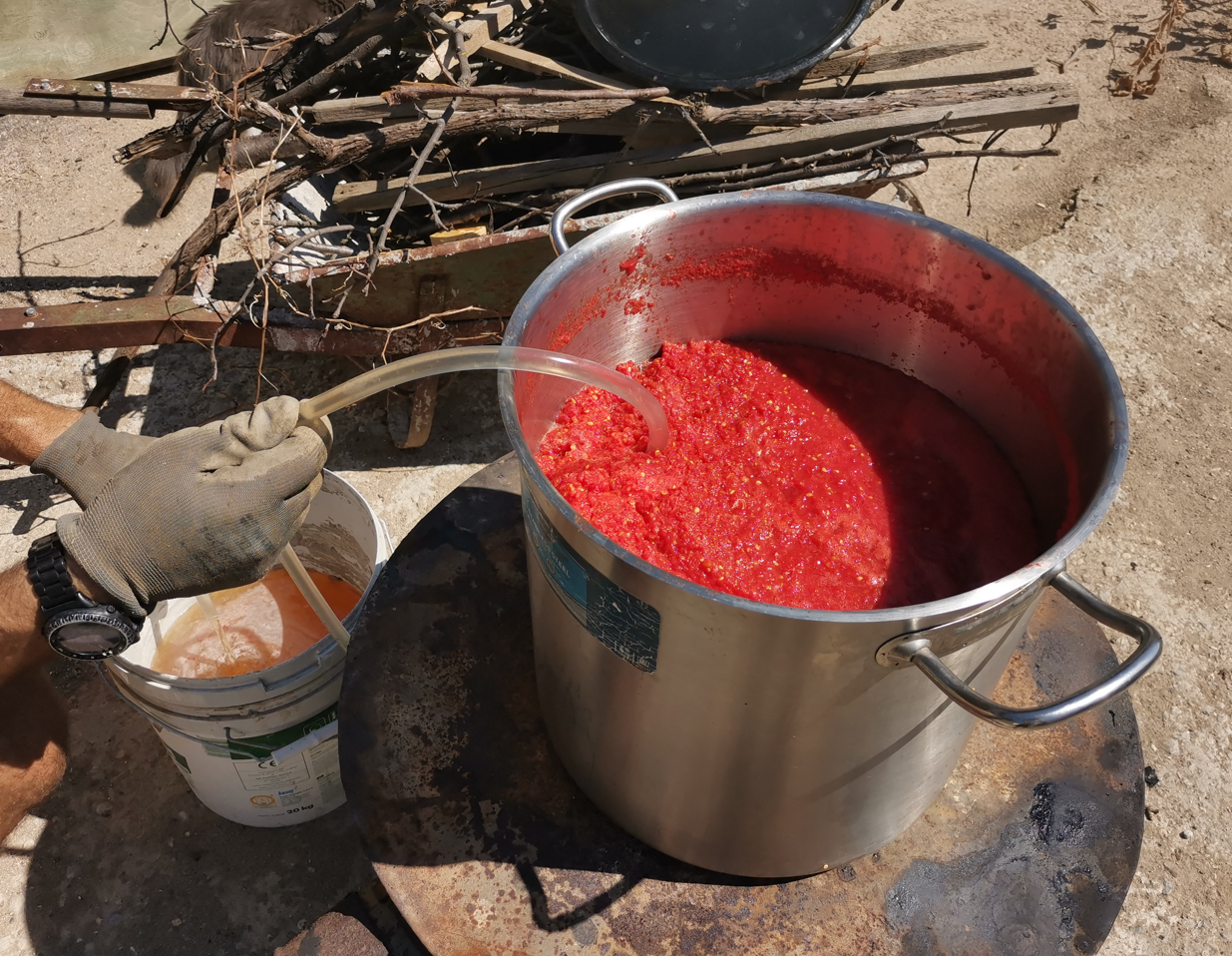В интерес на истината ,като събрахме накрая всички домати в казана от 4-те тенджери и пак затоплихме, констатирахме, че още течност се е отделила и пак го приложихме , като източихме още едно кофа почти.