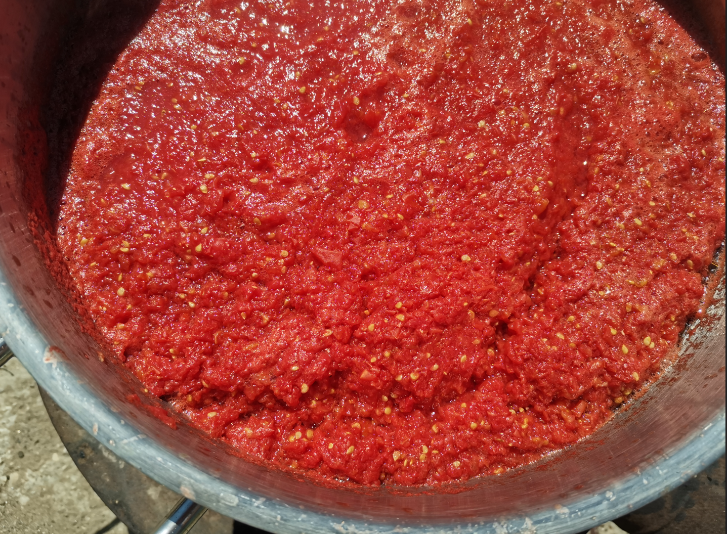Общо станаха 100 кг домати набрани. Рано събота сутрин почнахме, опита ми с машинката за махане на люспи и семки приключи още на вторият кг и след това махнахме приставката и продължихме с мелачката за домати само.