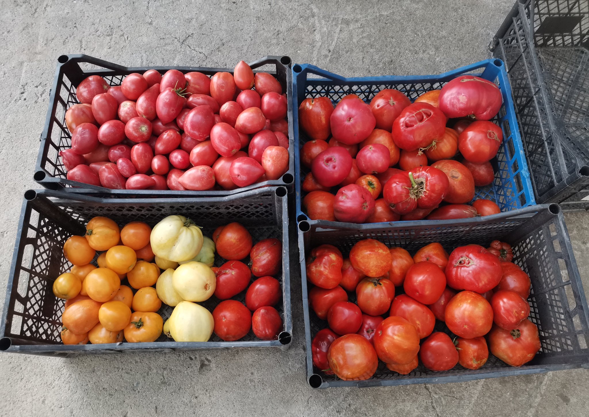 Aila и у дома беше консервна фабрика три буркана корнишони, двайсет изварени домати и три за салата. Тази година реших да не си играя с машинки за семкни люспи. Установих, че Албенга се белят много лесно и така си обелих за три буркана, после подкарах и останалите , та едните в робота за два три оборота, другите , които не са много добре обелени в Нутрибулет. За няколко часа четири кофи бяха  обработени. В голямата тава на огъня за час бяха готови. От миналата година са ми останали шишета със сок та сега за миш маш, спагети и салата само ще правя.
