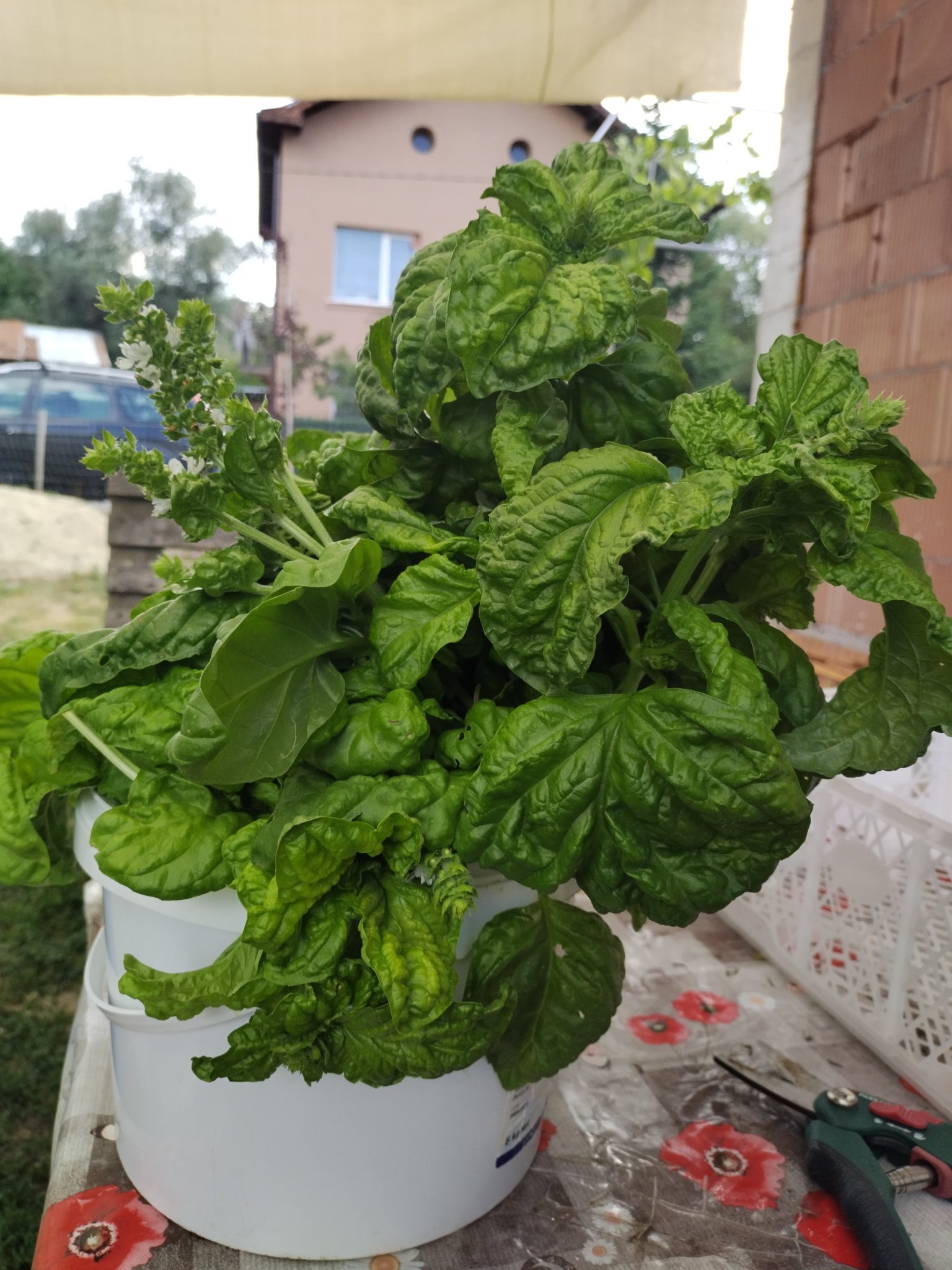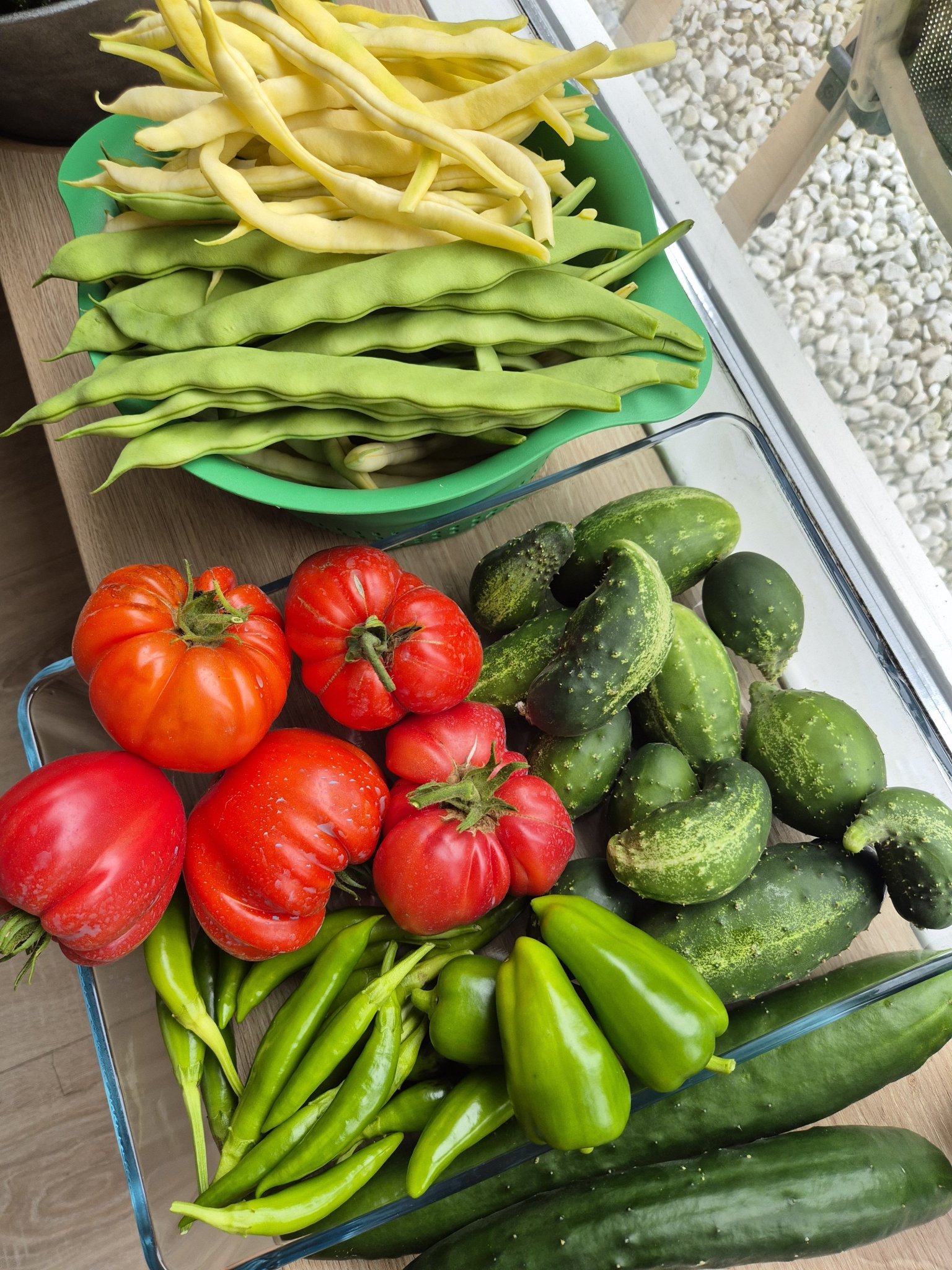 При мен реколтата е от домати и краставици, магданоз и босилек, малко тиквички, ягодки, малини, къпини. Зеленият ми боб започва да цъфти. Краставици имам все още и за раздаване, доматите вече са горе-долу колкото ни трябват за седмицата и съвсем малко давам на съседката - засега все още имам възможност.