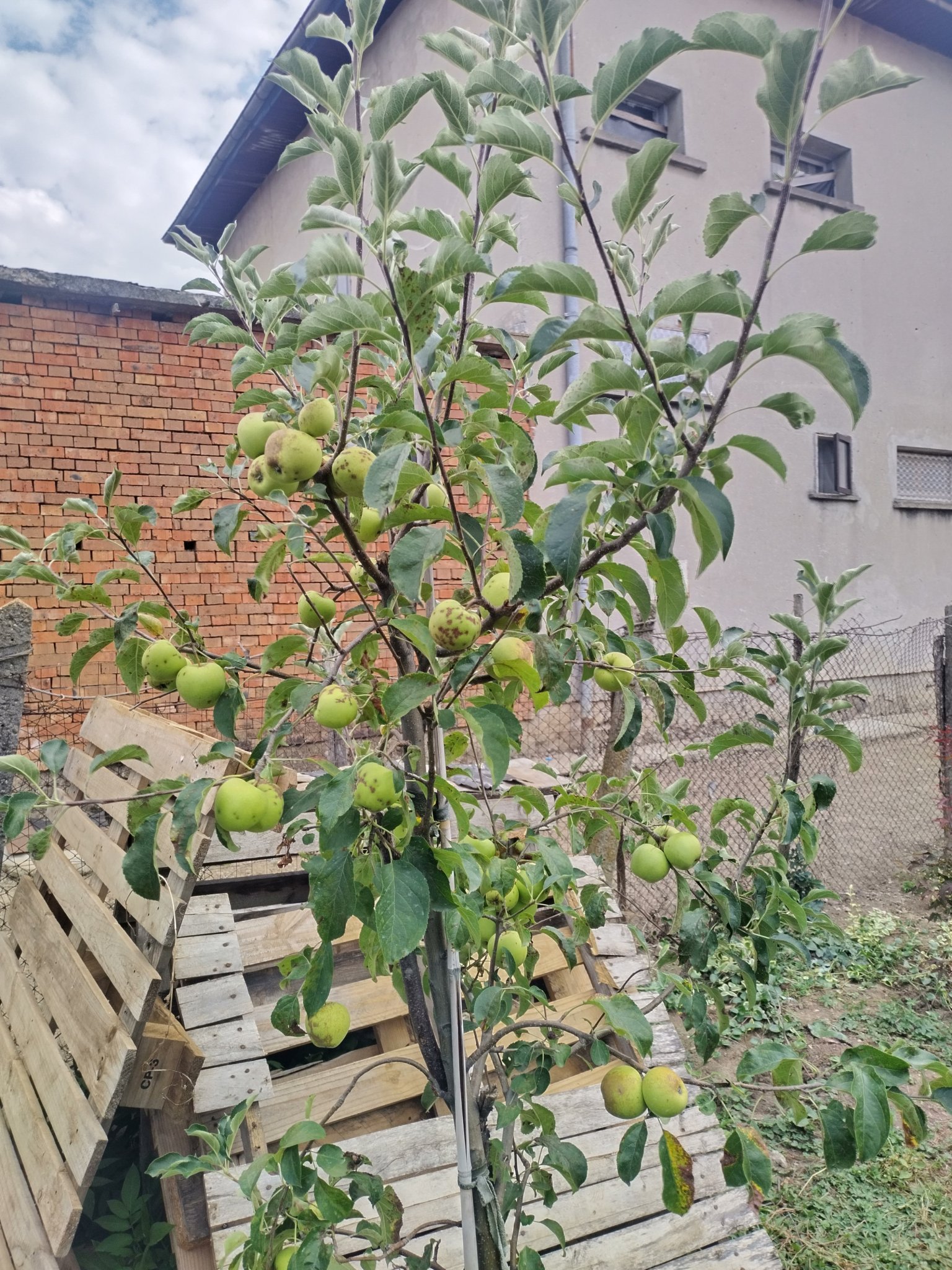 Единствената вързала ябълка в изпуснах напролет, има струпясване. Не напръсках със системен препарат (обикновено след зимното с бордолезов 2 % се правят минимум две напролет, ползвам Скоро), третирах с био препаратите цял сезон. Хем е болна, хем червива.