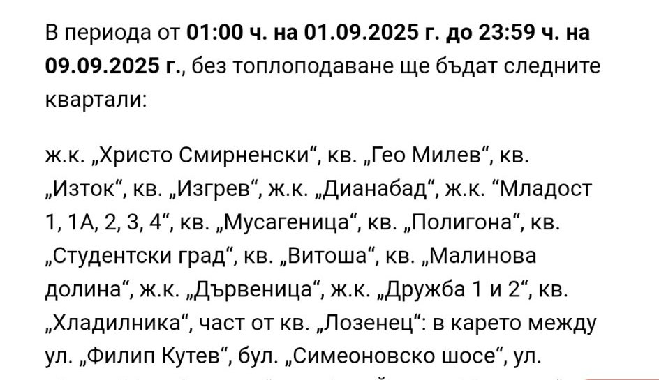 📆 ВАЖНО: В периода от 7 август до 30 септември 2025 г. ще бъде временно спряно топлоподаването към трите блока, за да се осигури безопасно изпълнение на работите и бъдещо по-надеждно отопление.