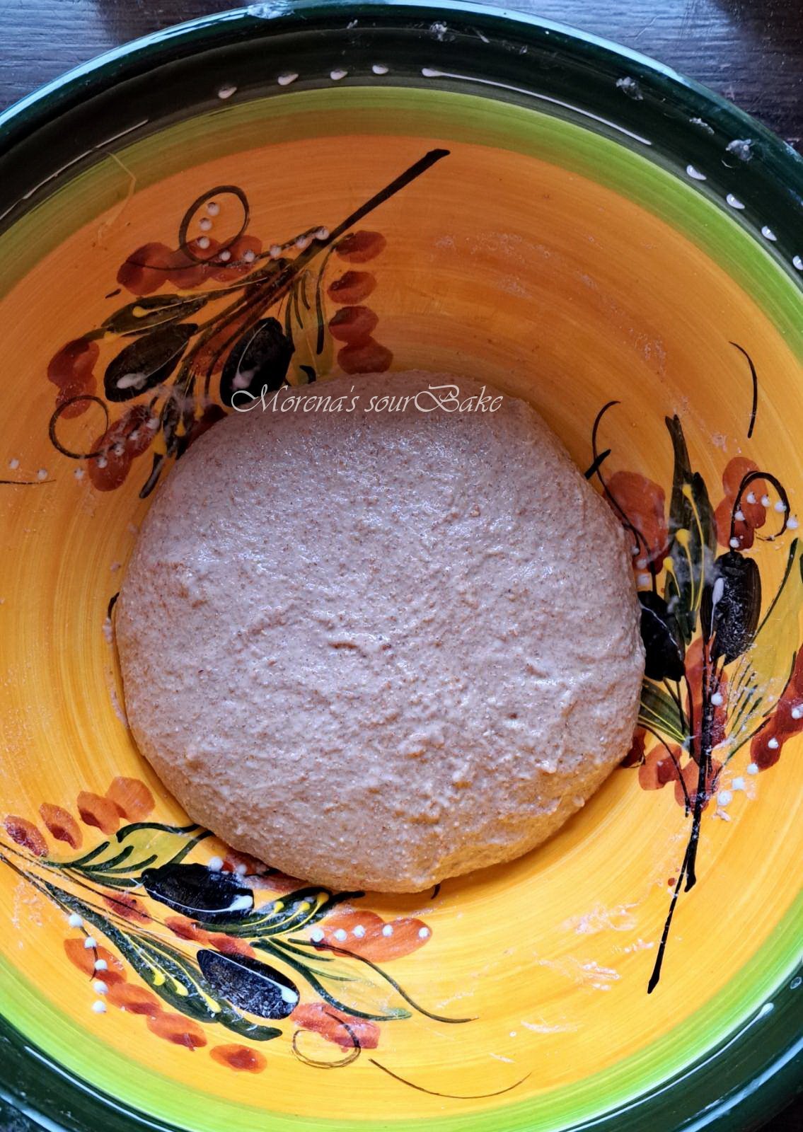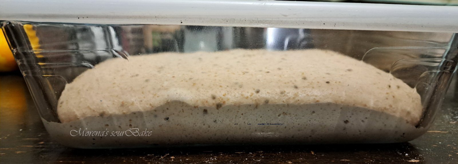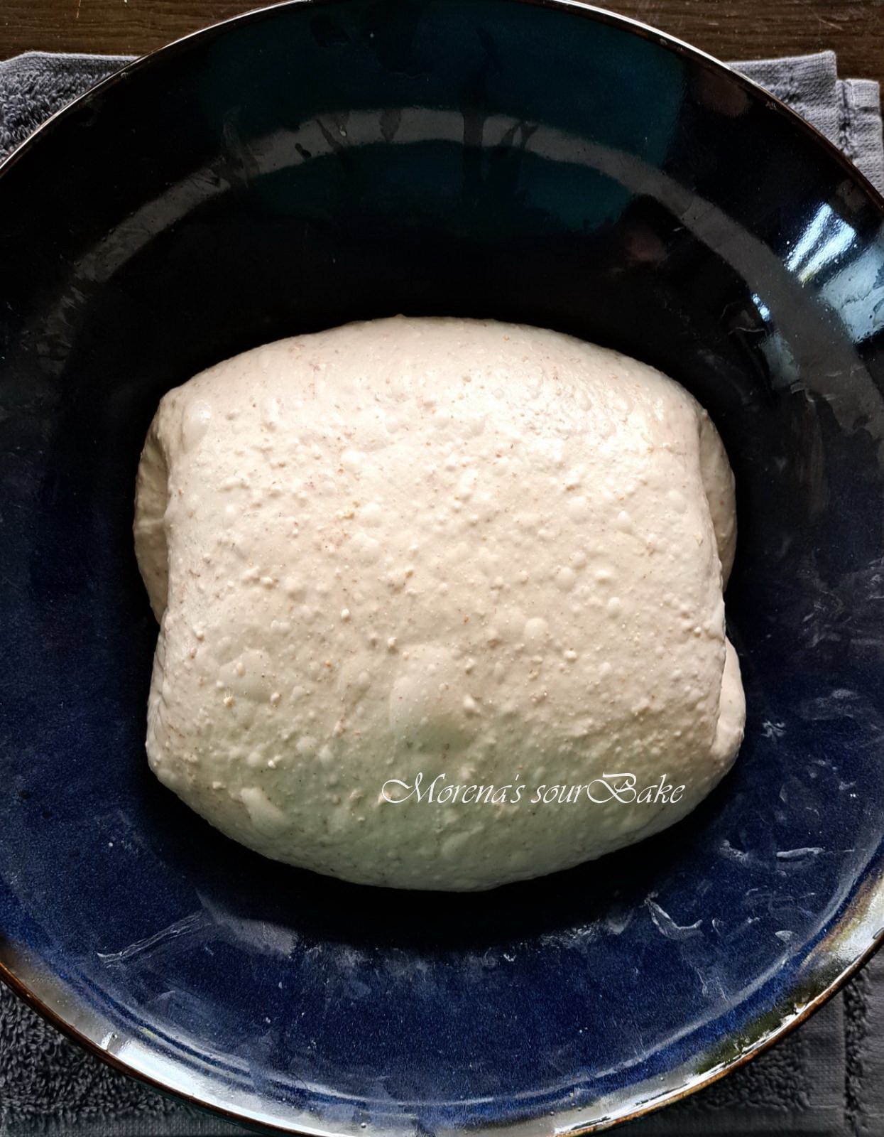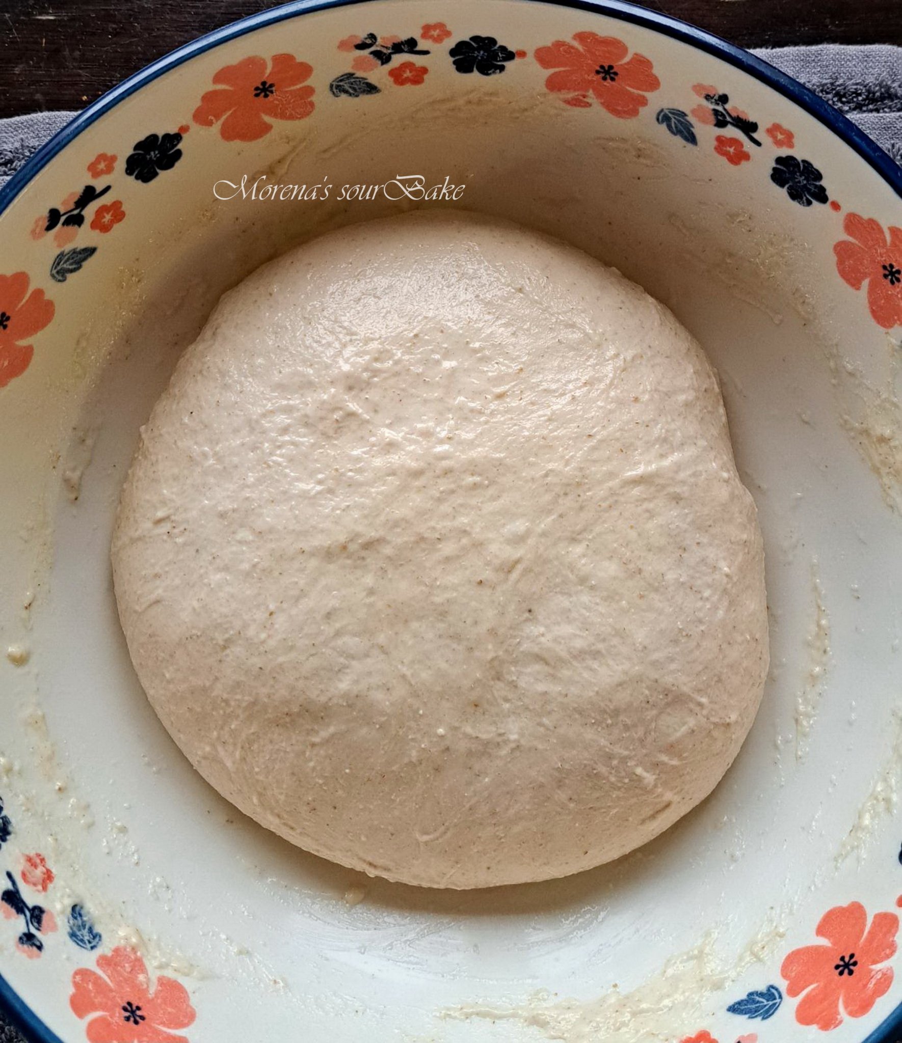 Автолиза 1час.  Вътрешни сгъвания 4 през 45мин. и оставих да довтасва в покой.